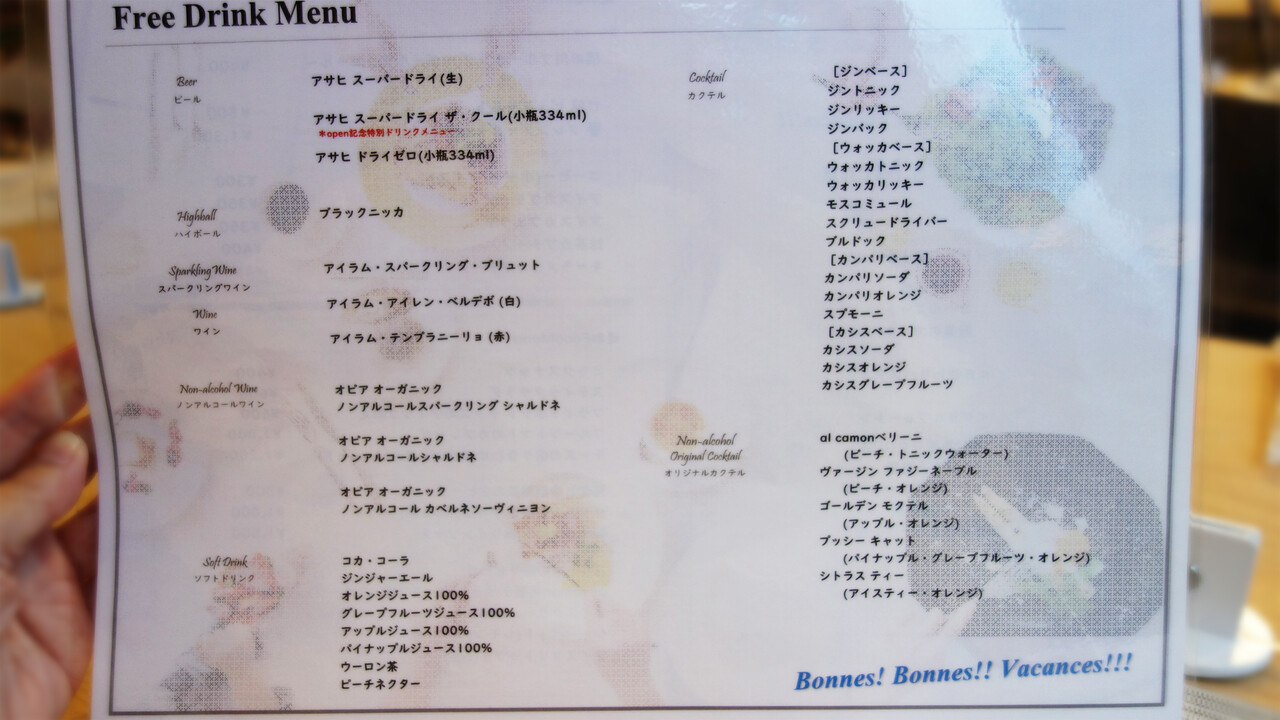今回は、『Bonnes! Bonnes!! Vacances!!!(ボンボンバカンス)』という飲み放題付きのディナープランを利用しました。