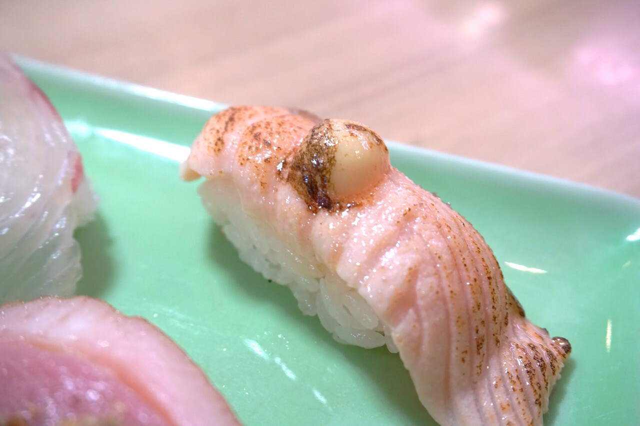 一番のオススメらしい『若竹丸5点盛』352円・『北海道産 生ホタテ塩炙り』253円・『炙りイカ』110円・にぎりには珍しい『島原ハム』110円を注文しました。