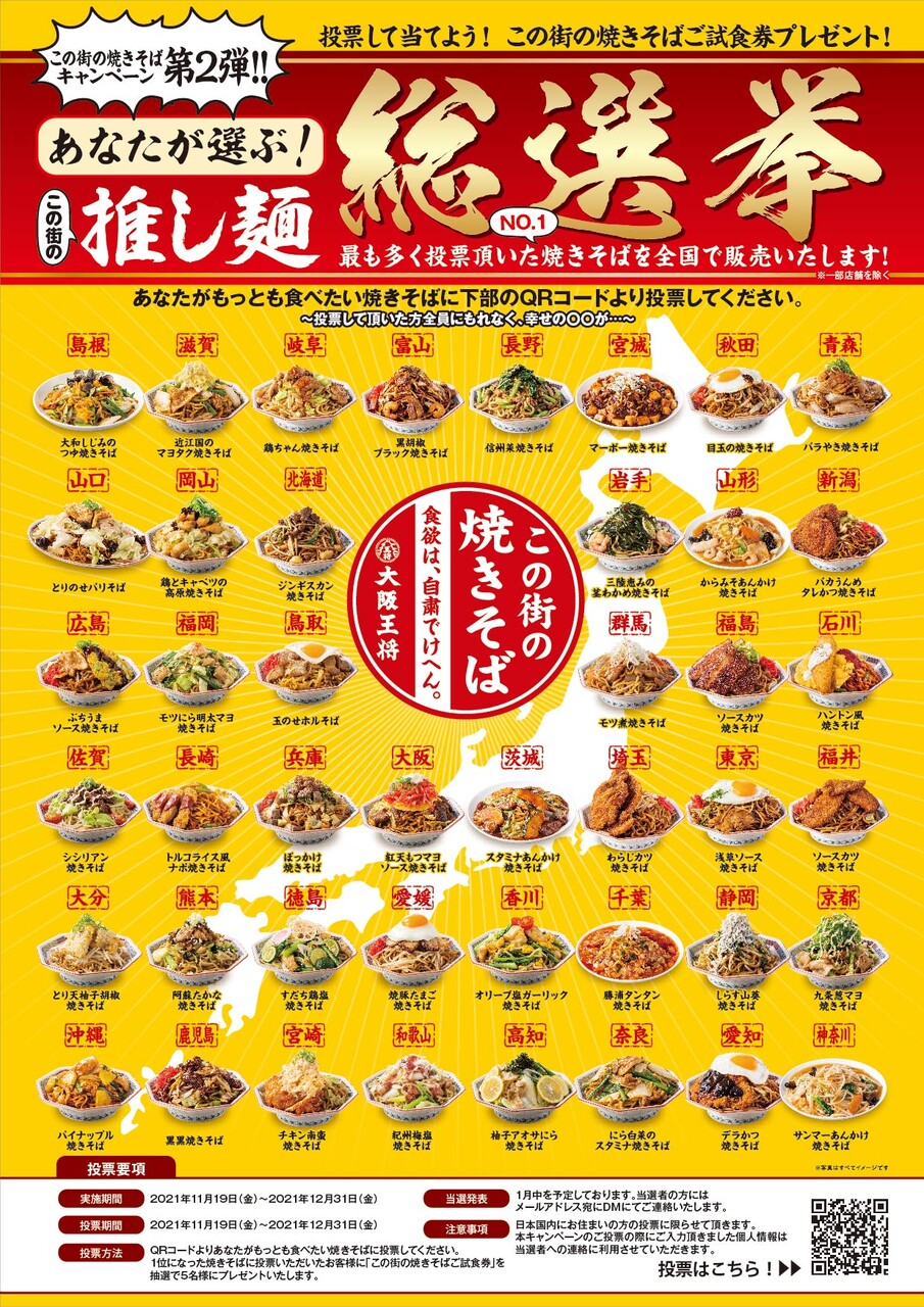 大阪王将が現在開催しているご当地焼きそば総選挙の地域限定メニューです。