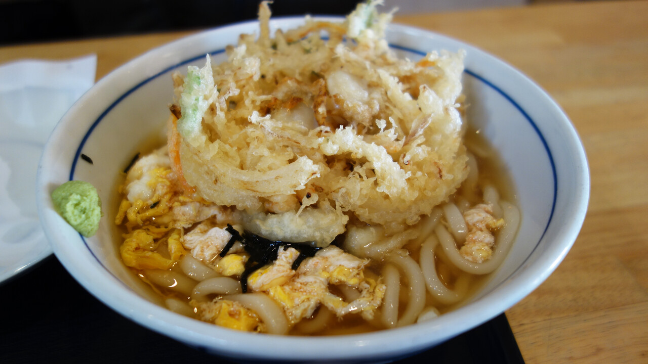 肉・海老天・紅白の揚げ餅が入った豪華なうどんです。