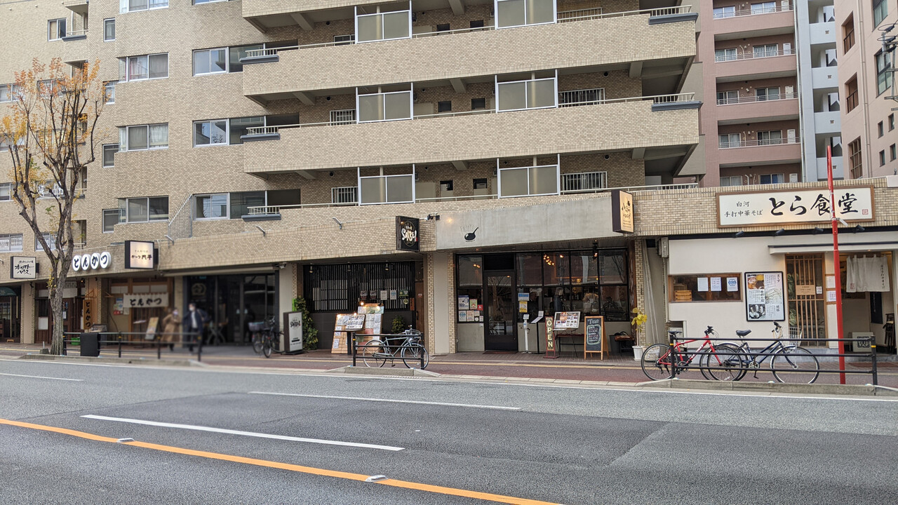 ビル1階の並びには、とら食堂(中華そば)・山本のハンバーグ・とんかつのポーク凡平・ホワイトハウス(炉端焼)・ プリモピアット(イタリアン)・フォーシーズンミラン(インド料理)があります。