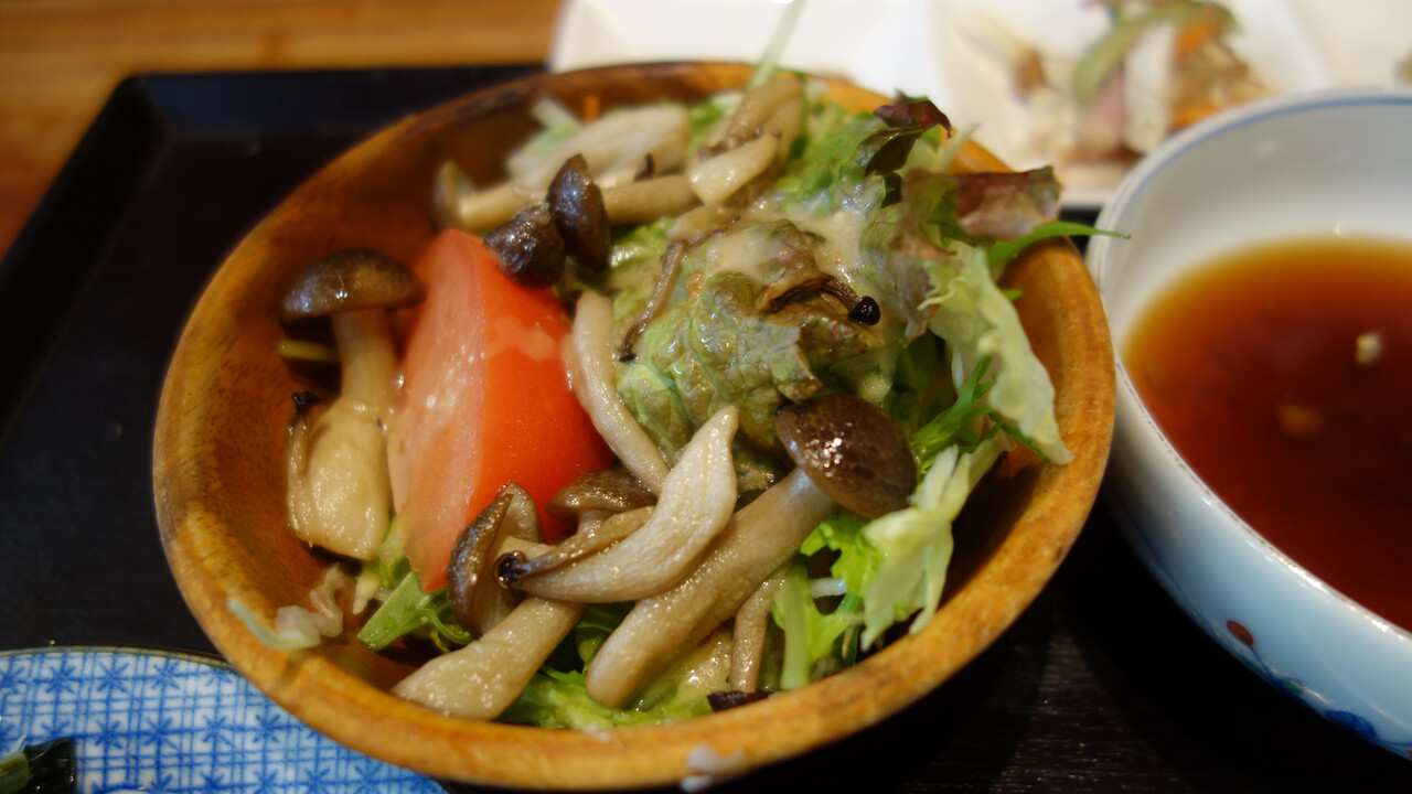 天ぷら6点盛・刺身5貫・小鉢・魚の煮付け・サラダ・ご飯・味噌汁の内容です。