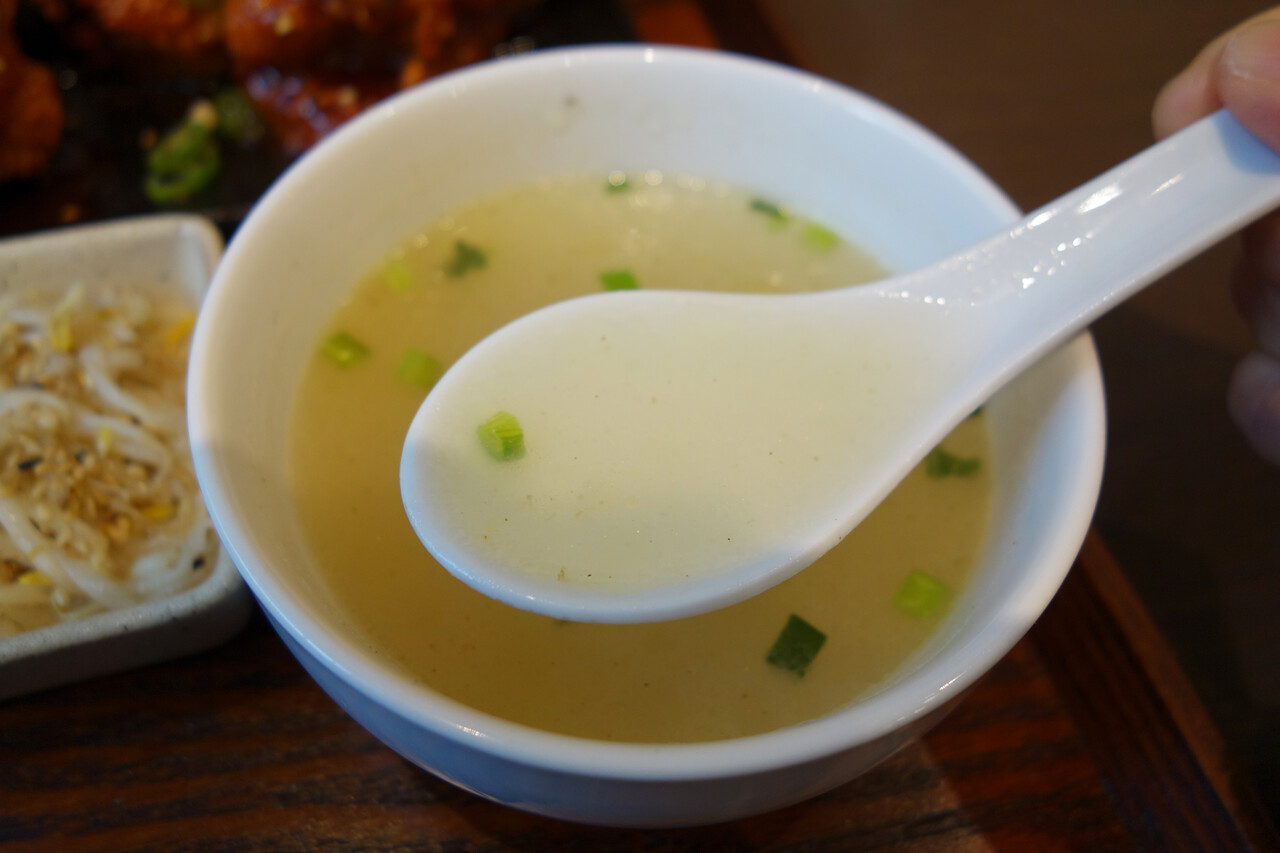 定食には、白ご飯・スープ・おかず3種が付いています。