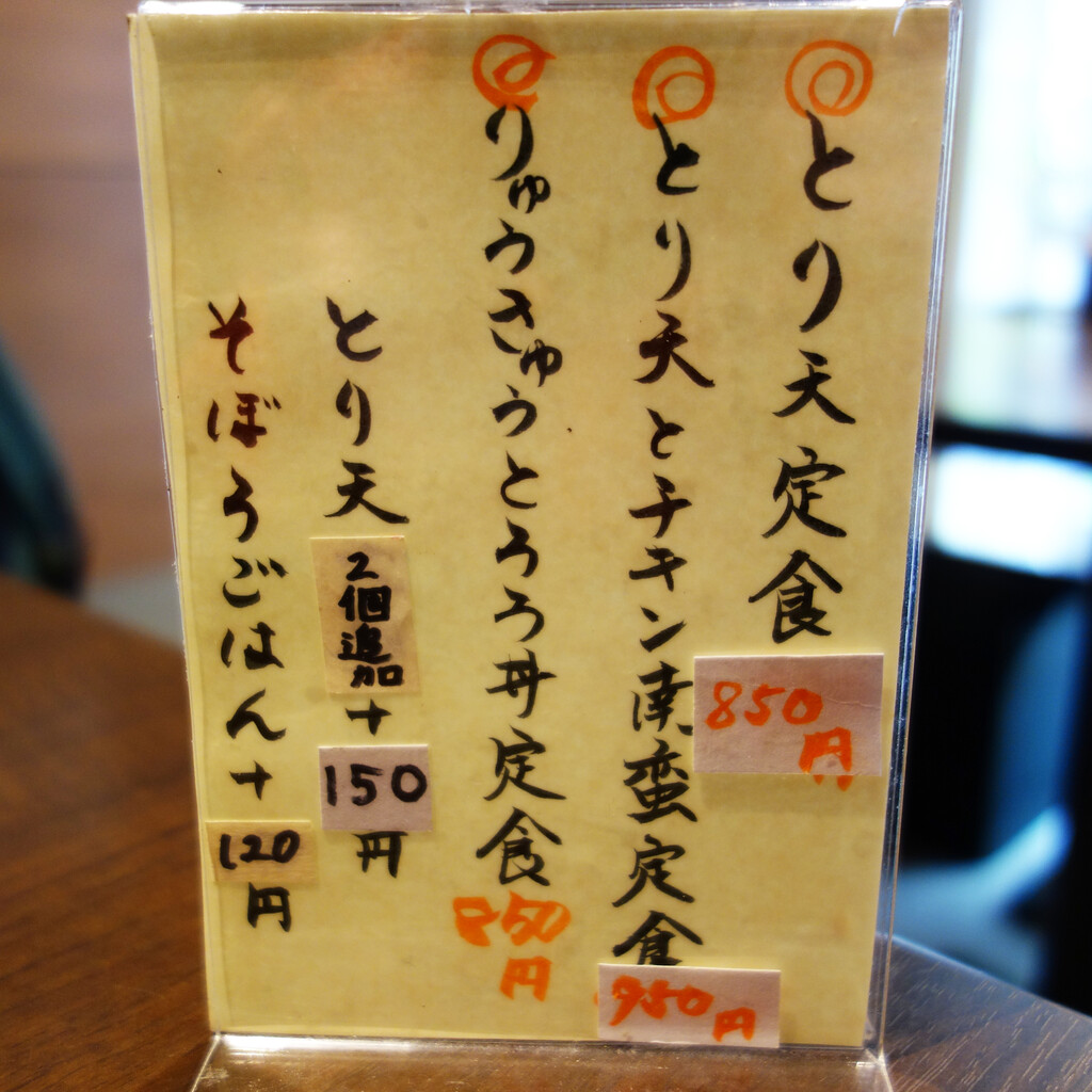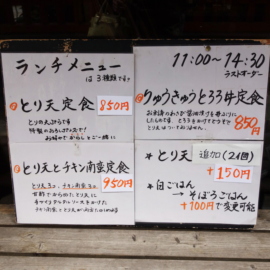 とり天定食850円・とり天とチキン南蛮定食950円・りゅうきゅうとろろ丼定食の3種類です。
