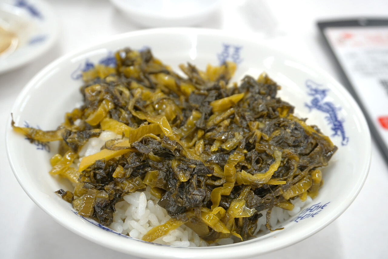 昔から家庭の食卓で親しまれているような高菜漬け炒めをのせた白ご飯です。