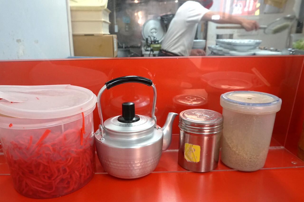 赤い卓上には、紅しょうが・タレが入った小やかん・コショー・すりごま。