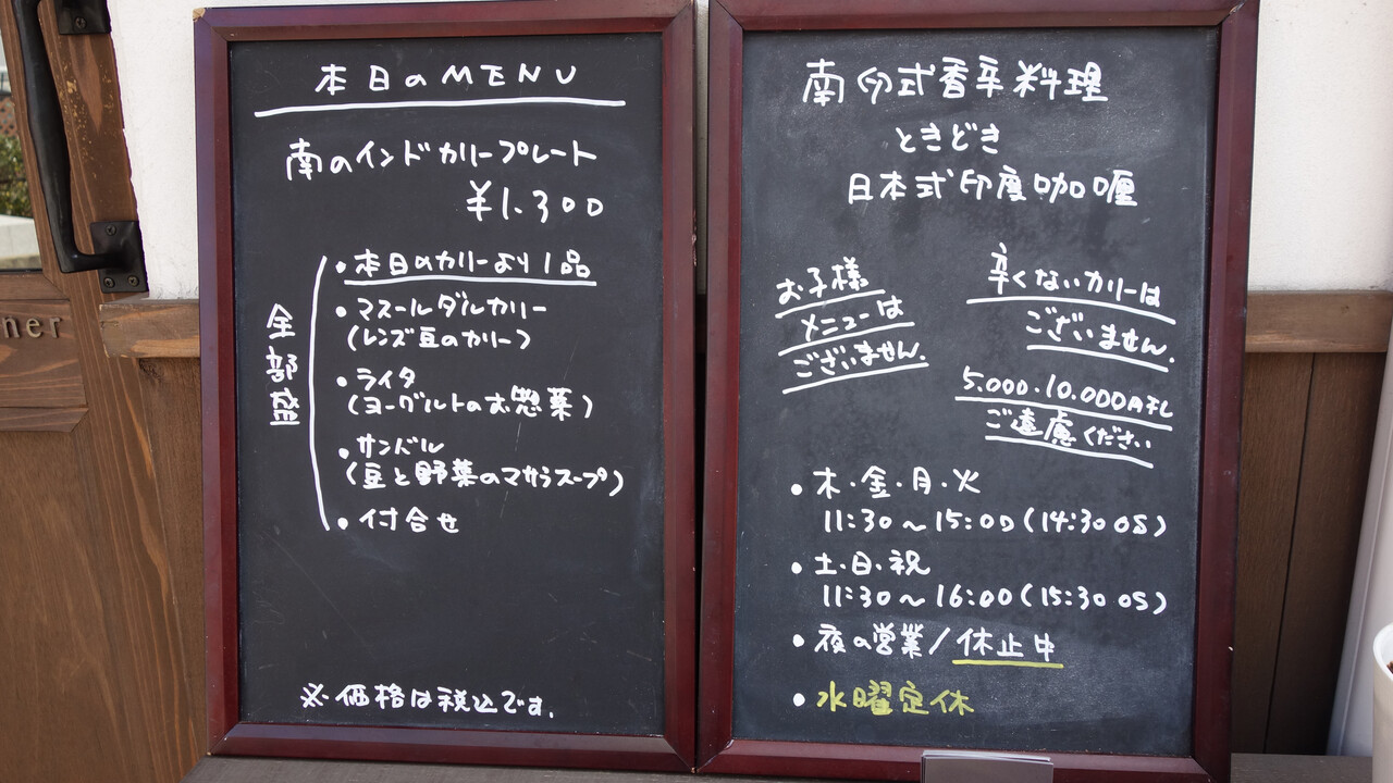 訪問時のメニューは、カレー単品と、副菜やスープを盛り合わせた『南のインドカリープレート』がありました。
