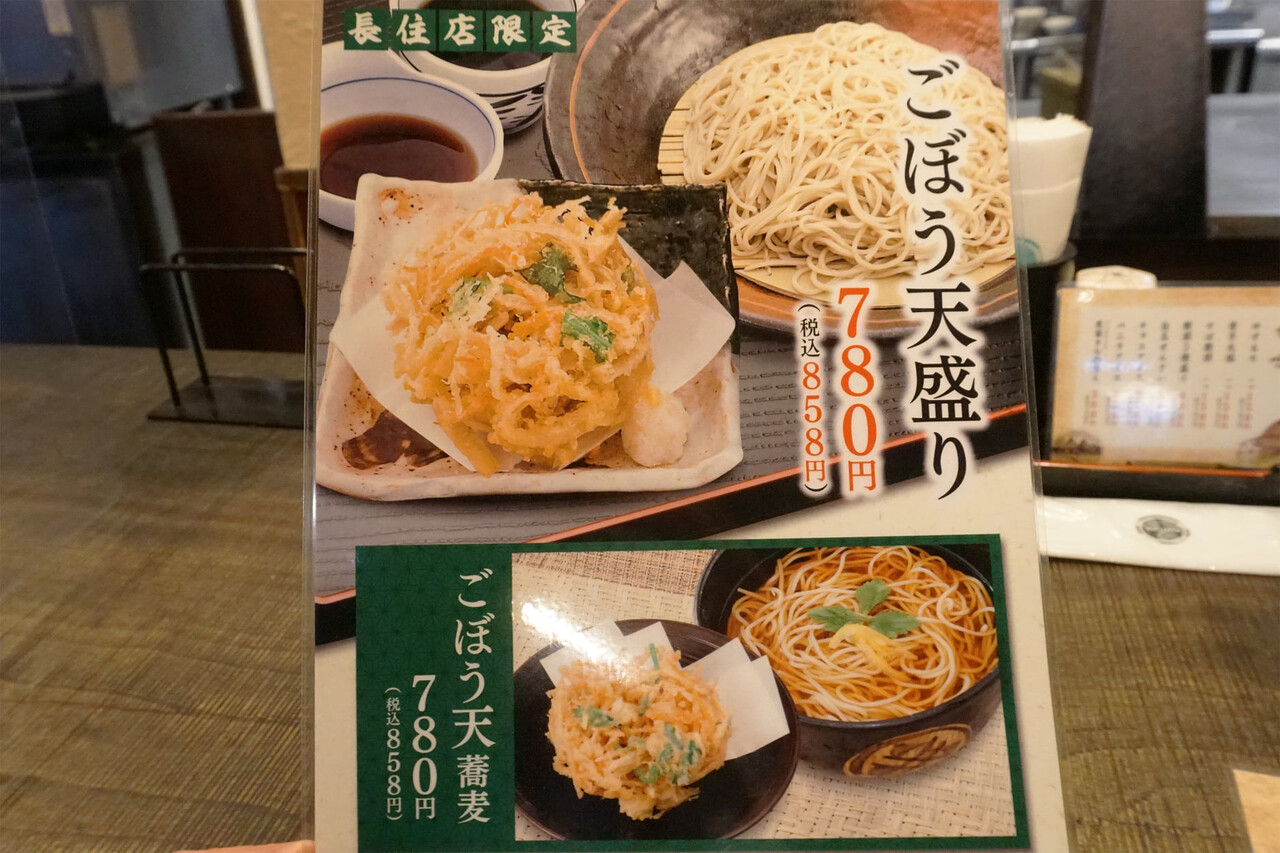 今回は、福岡市南区にある長住店限定の『ごぼう天蕎麦』858円を頂きました。