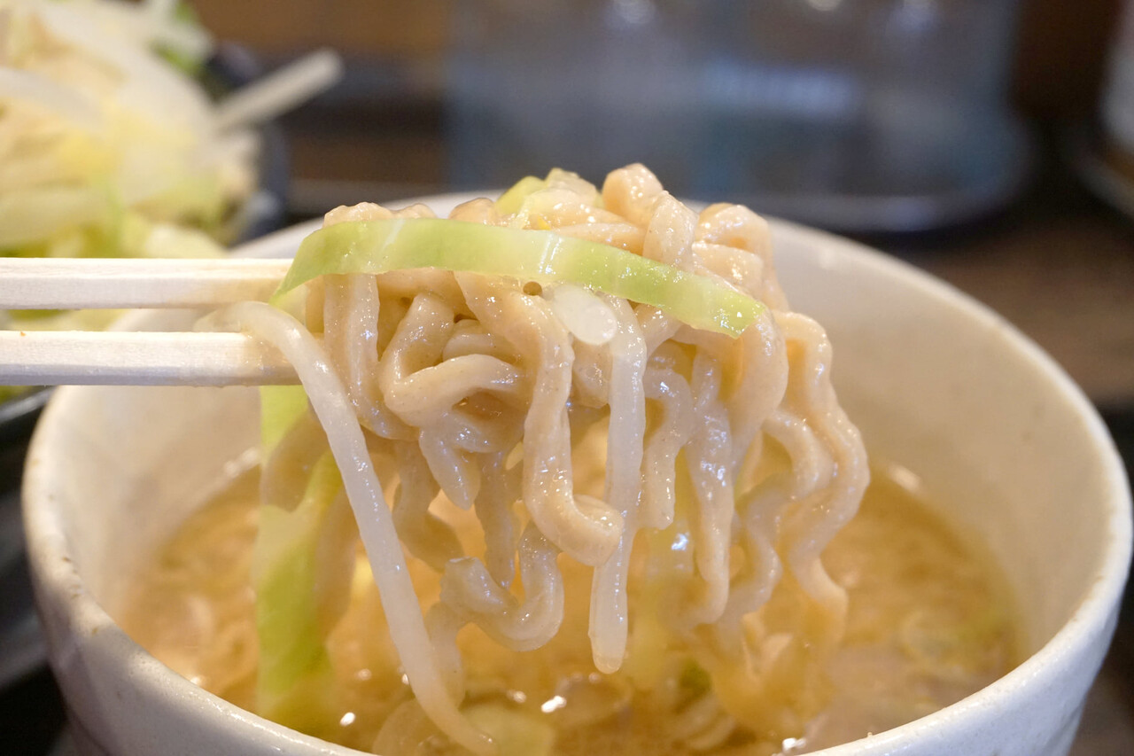 極太のガッツリ麺は、食べ応え十分。これに魅せられたファンも多いことでしょう。