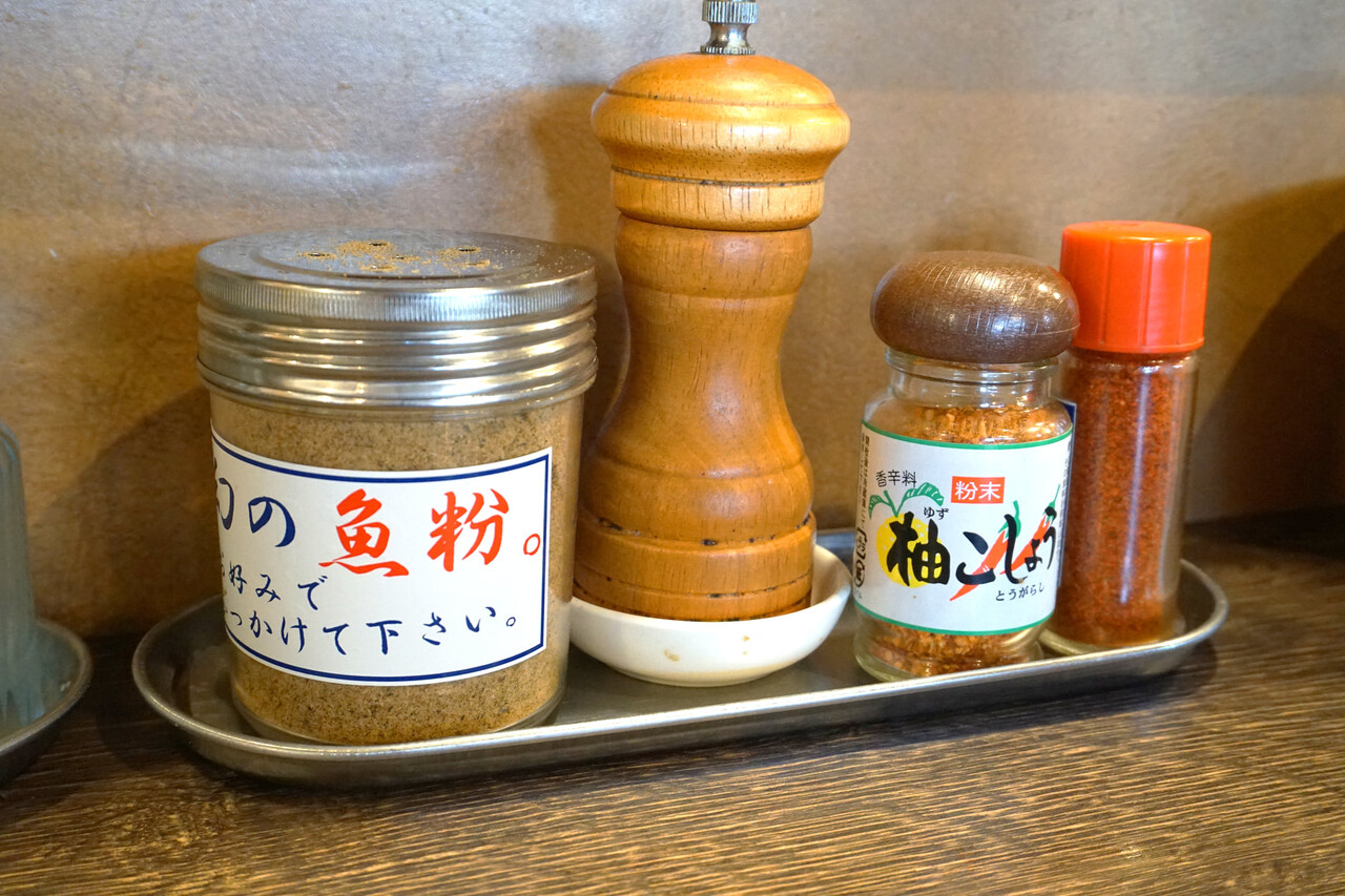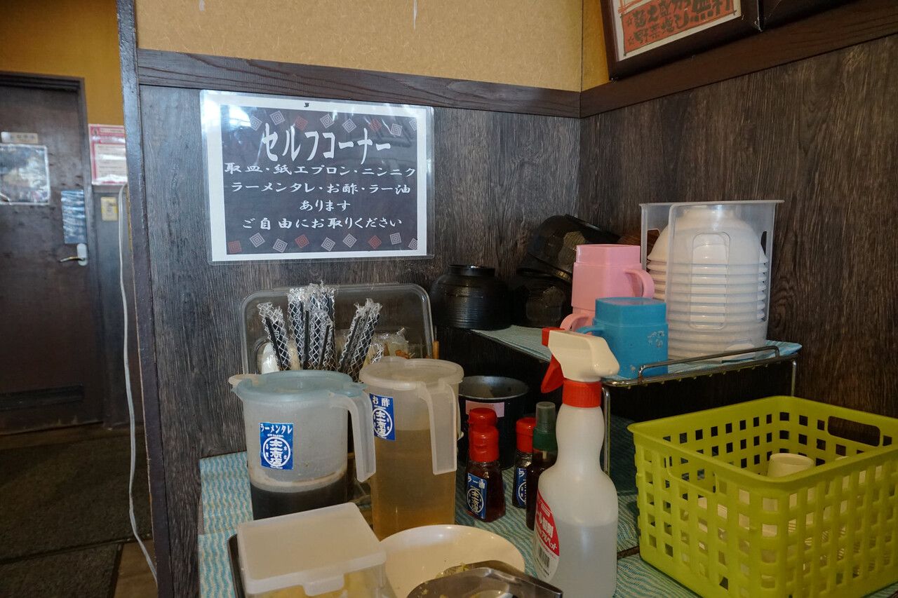 店内にセルフコーナーがあり、取り皿・紙エプロン・ニンニク・ラーメンダレ・お酢・ラー油などが常備されています。