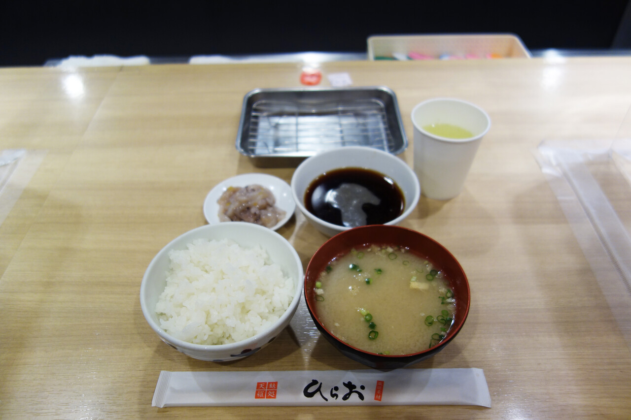 ご飯・味噌汁・天つゆ・イカの塩辛。