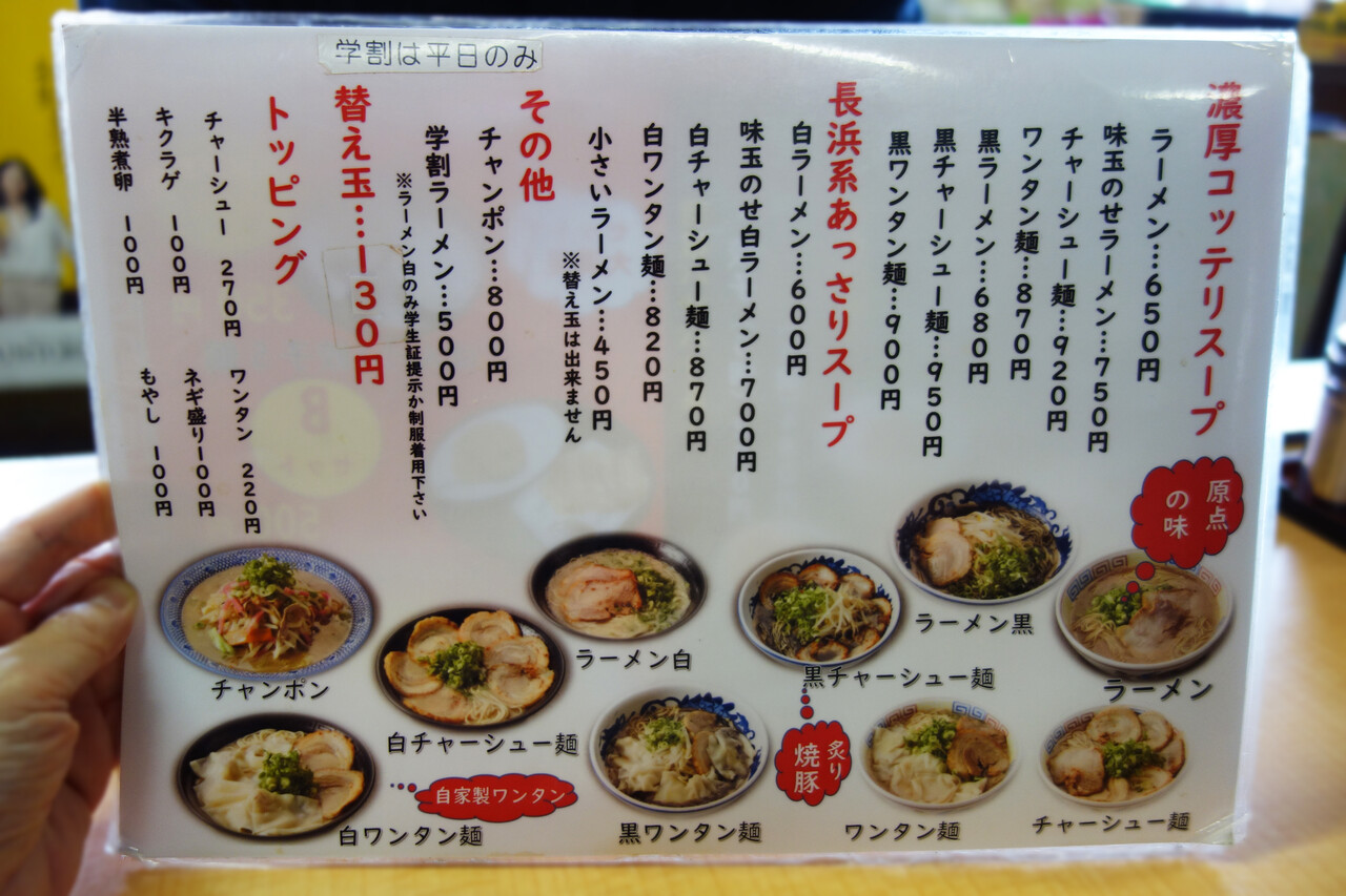 基本の濃厚ラーメンは650円、あっさりタイプの白ラーメンは600円です。