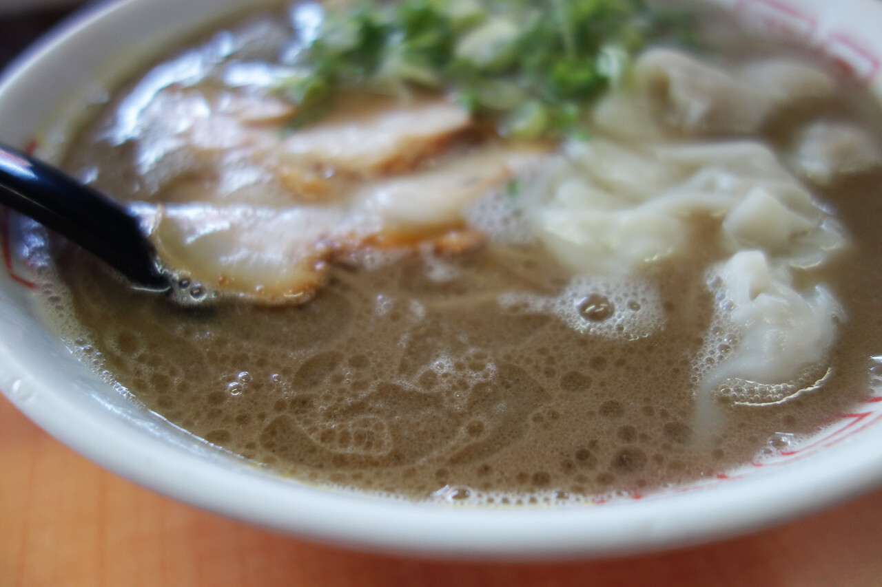 豚骨の髄のうま味を大釜でじっくりと抽出した濃厚スープは、グレーとも茶色とも言い難い色で、