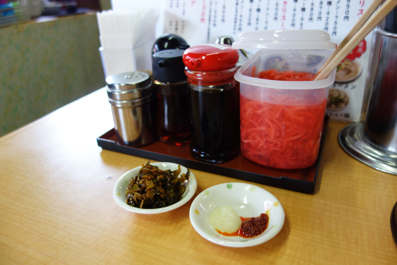 辛子高菜・おろしニンニク・辛味ペーストはセルフコーナーから取って来ます。