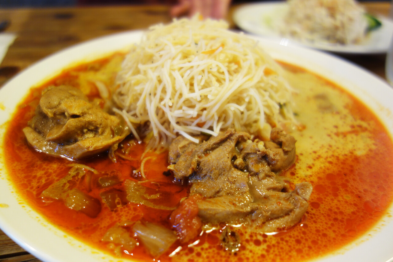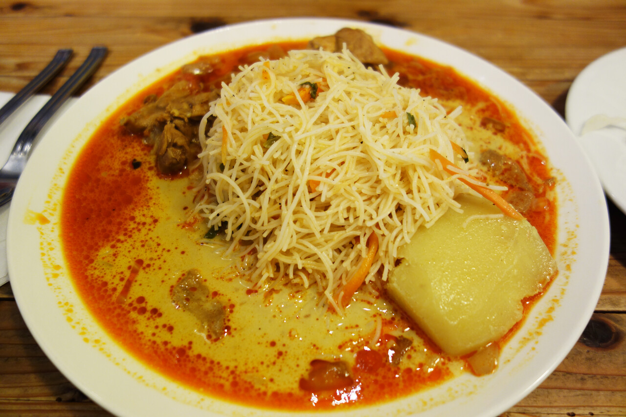 野菜入りの炒めビーフンはホロホロ柔らかく、カレーによく合います。