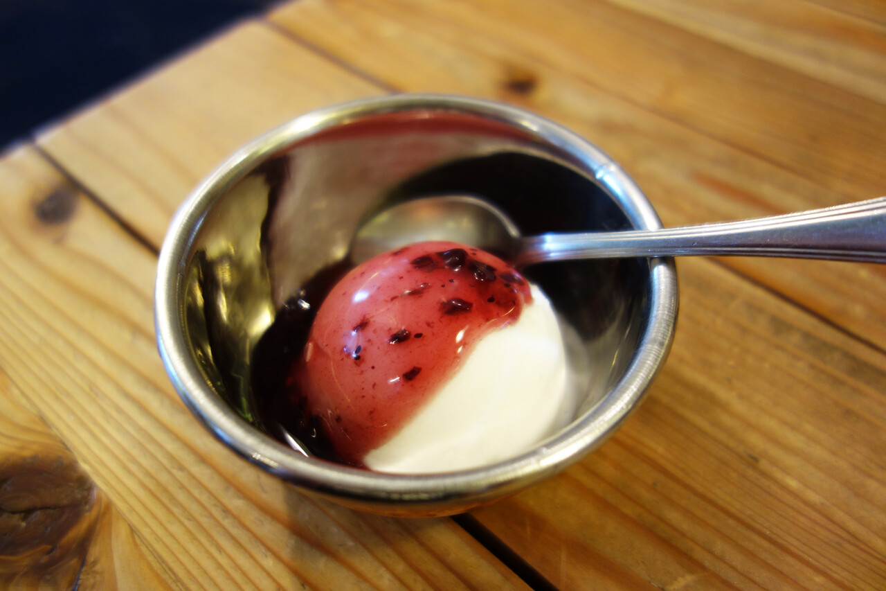 デザートは、ブルーベリーソースがけのヨーグルトアイス。