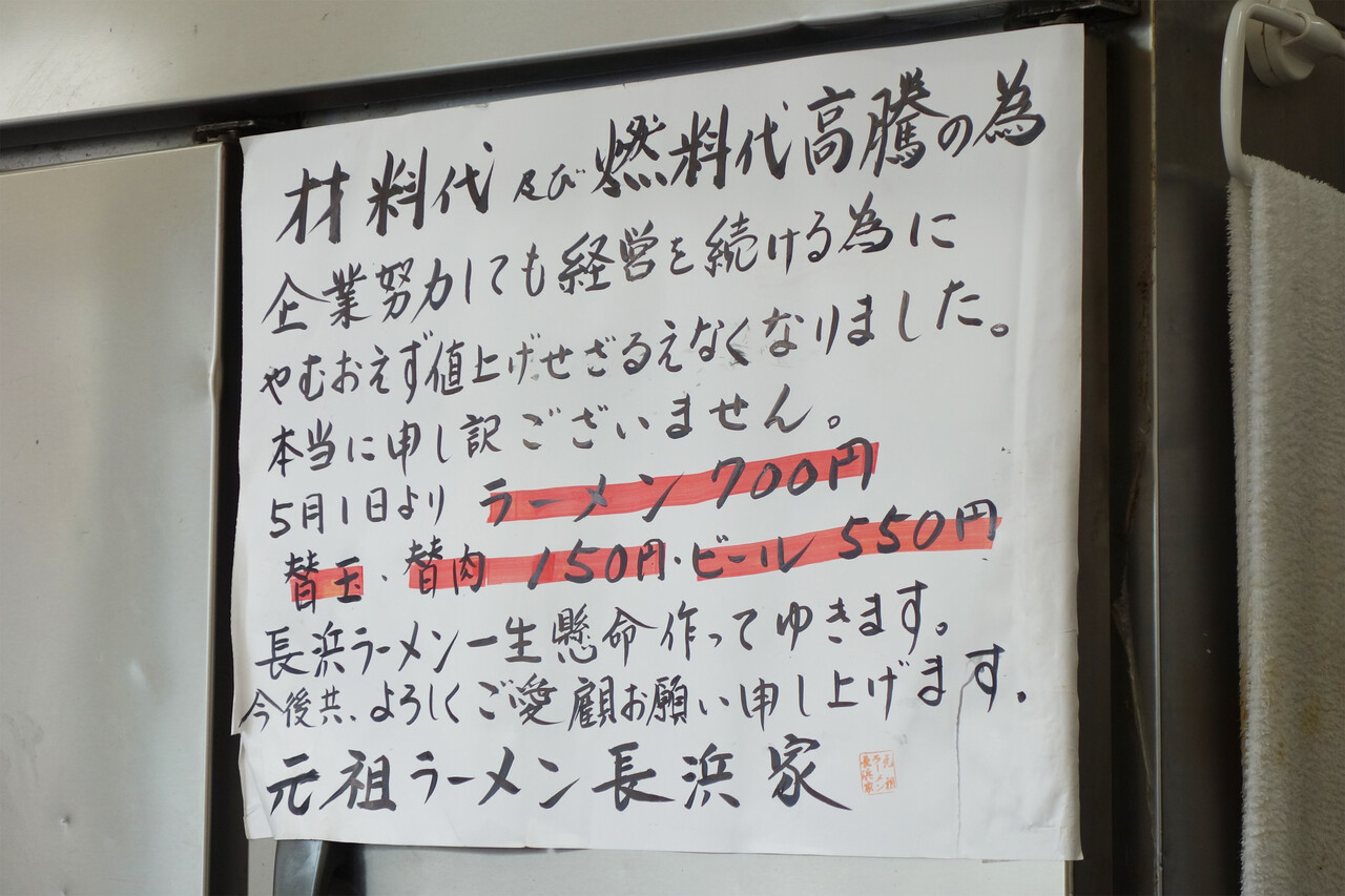 ちなみに、本家本元『元祖長浜屋』の現在(2022/6)のお値段はラーメン550円・替玉150円です。