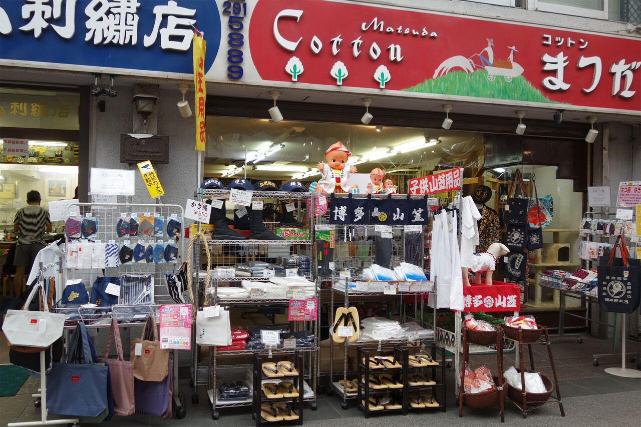 商店街には、山笠の季節になると、締め込みや地下足袋、ステテコ、雪駄など、