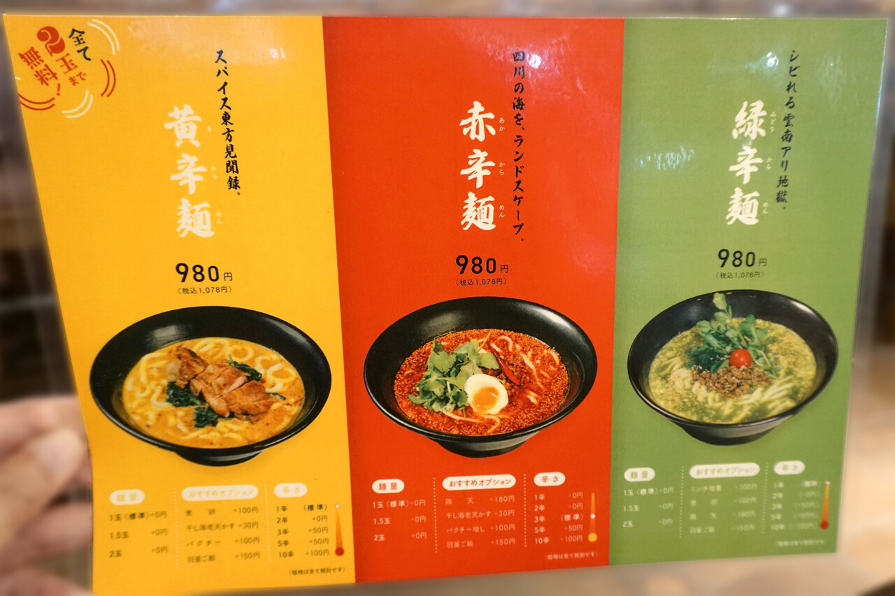 しっかり辛い『赤辛麺』、オリエンタルカレー味の『黄辛麺』、唐辛子・山椒味の『緑辛麺』の3種類があります。