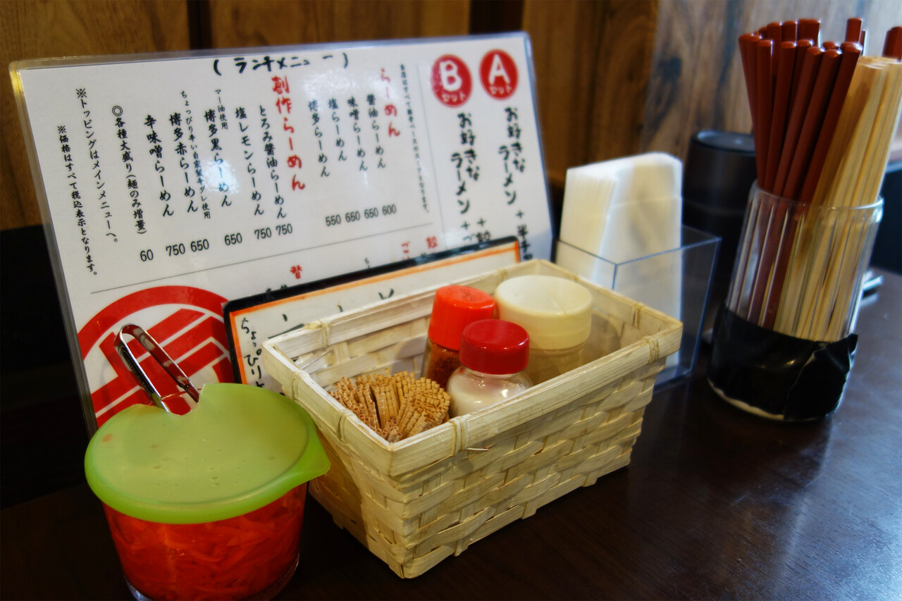 卓上には、紅生姜・塩・胡椒・一味。