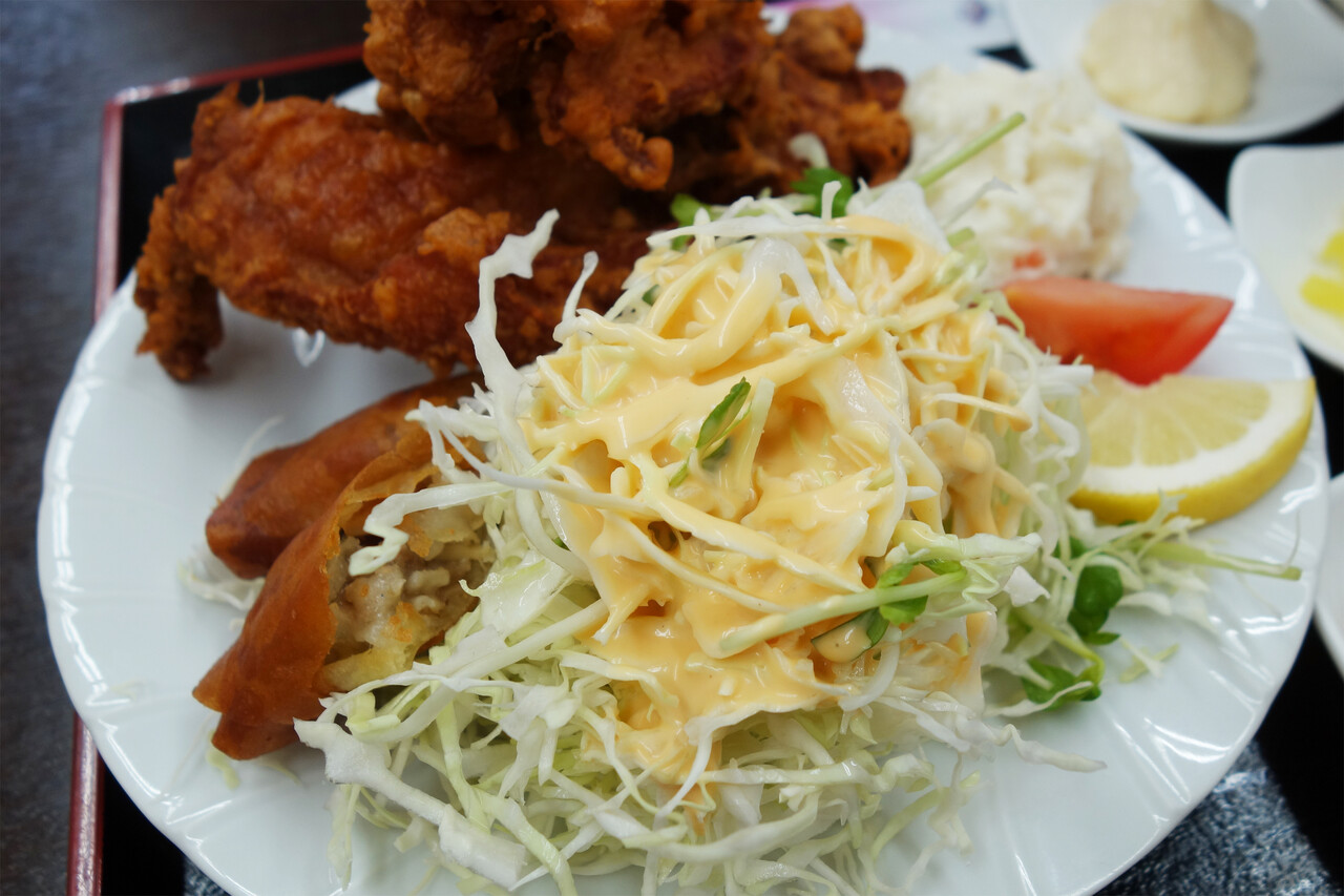 副菜には、たっぷりのキャベツ・ポテサラ・春巻きが付いています。