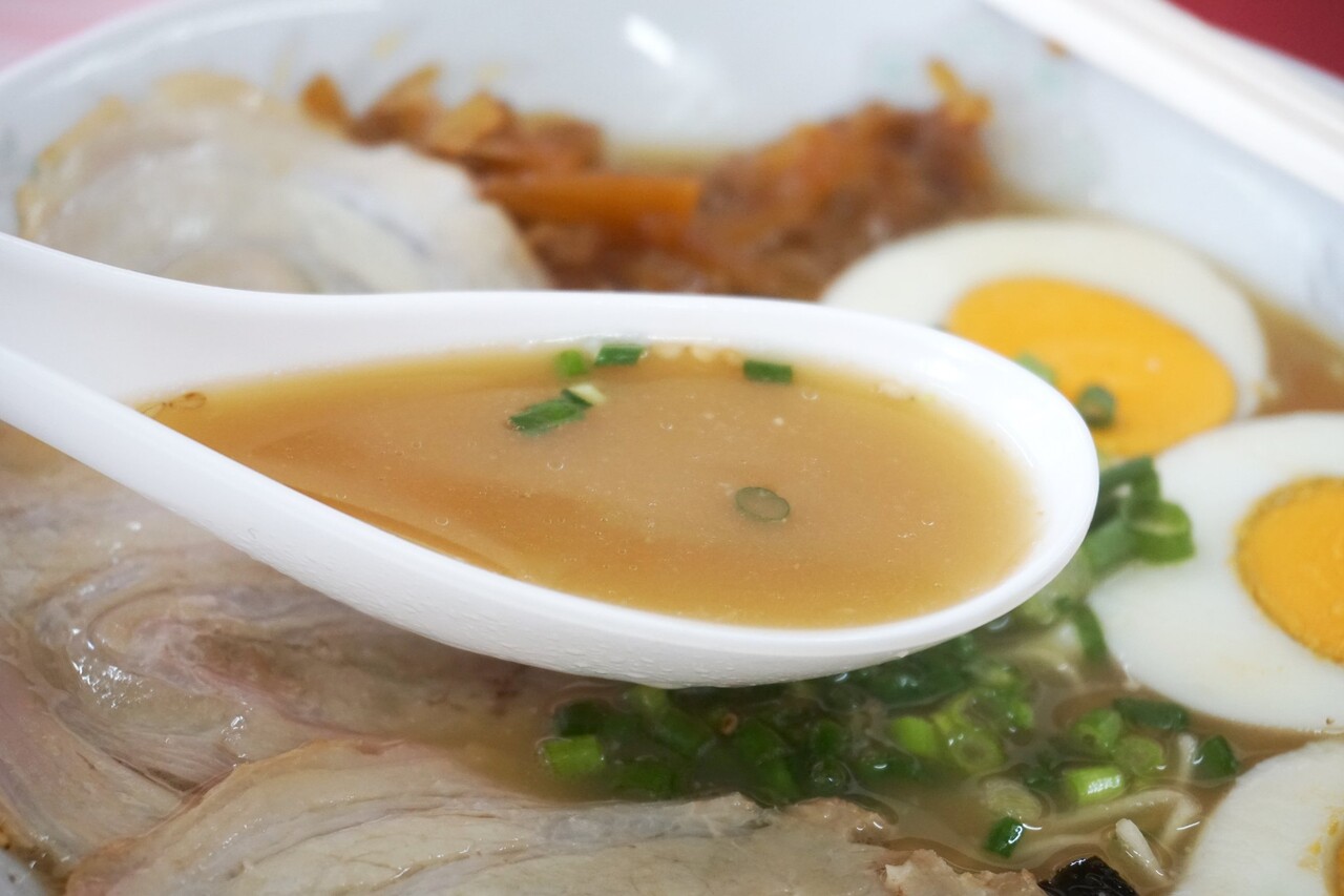 甘い醤油ダレが香ばしい、牛骨・豚骨・鶏ガラをベースにしたまろやかなスープ。