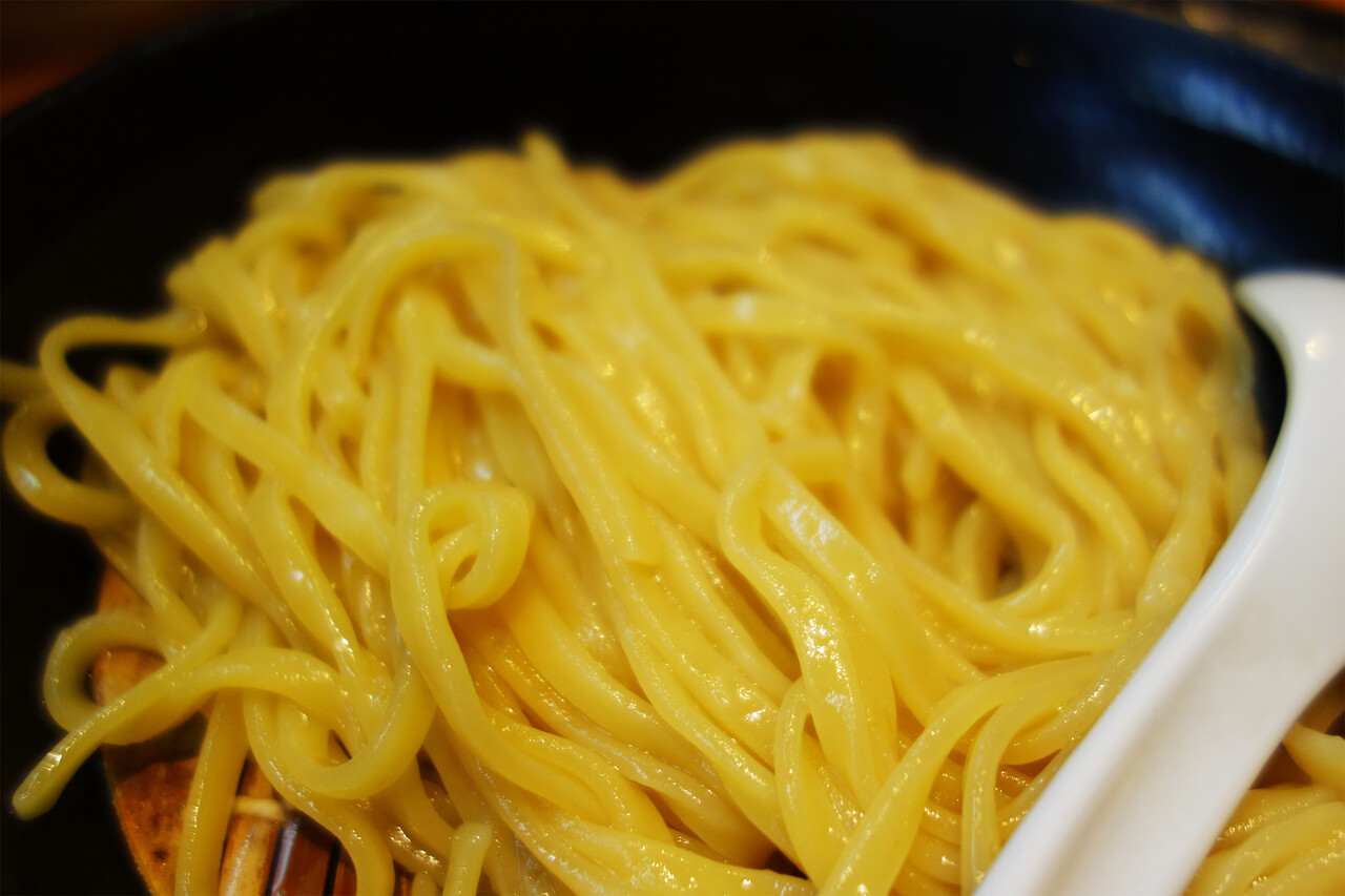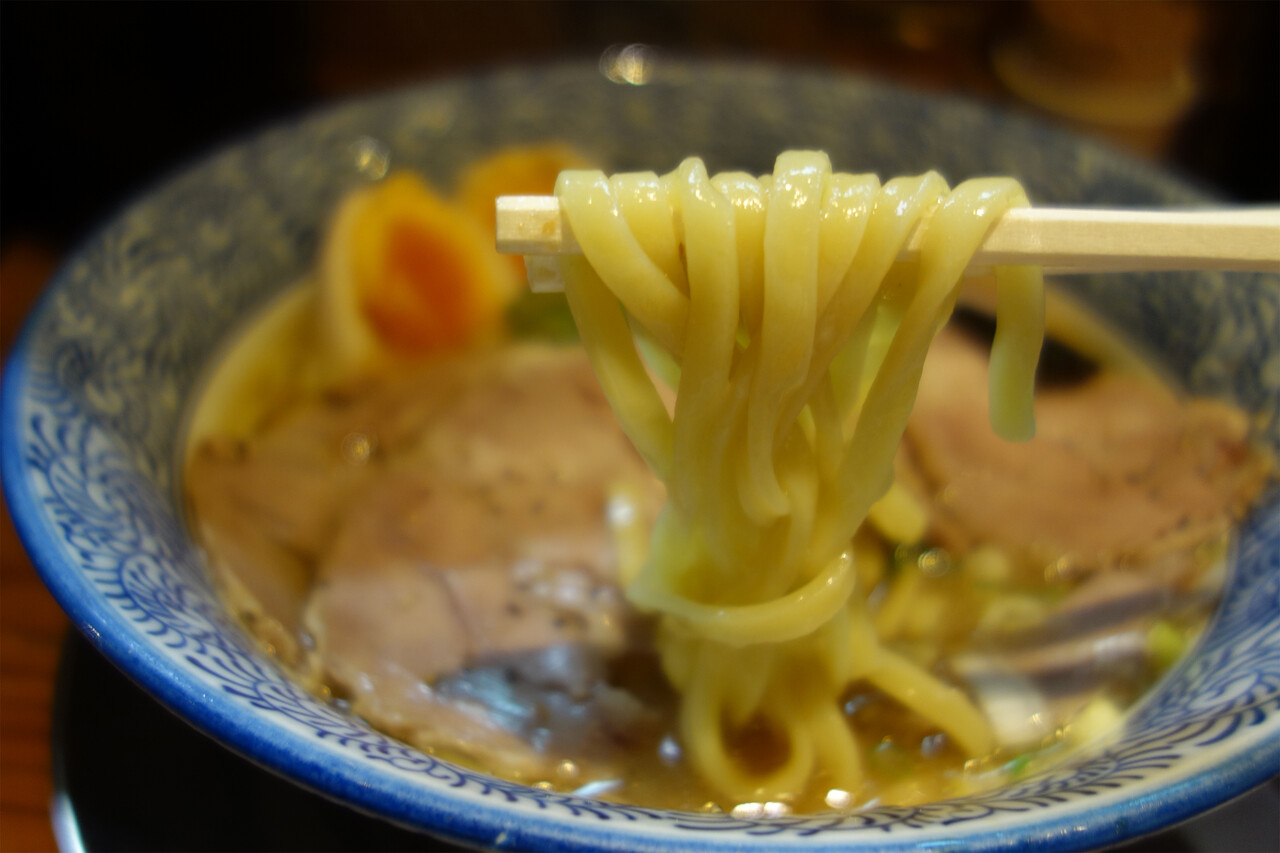 平打ち麺はツヤッツヤで滑らか。