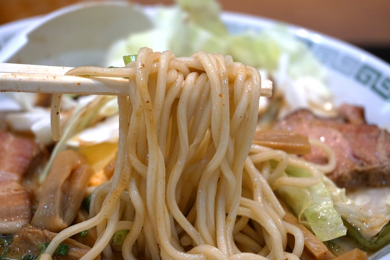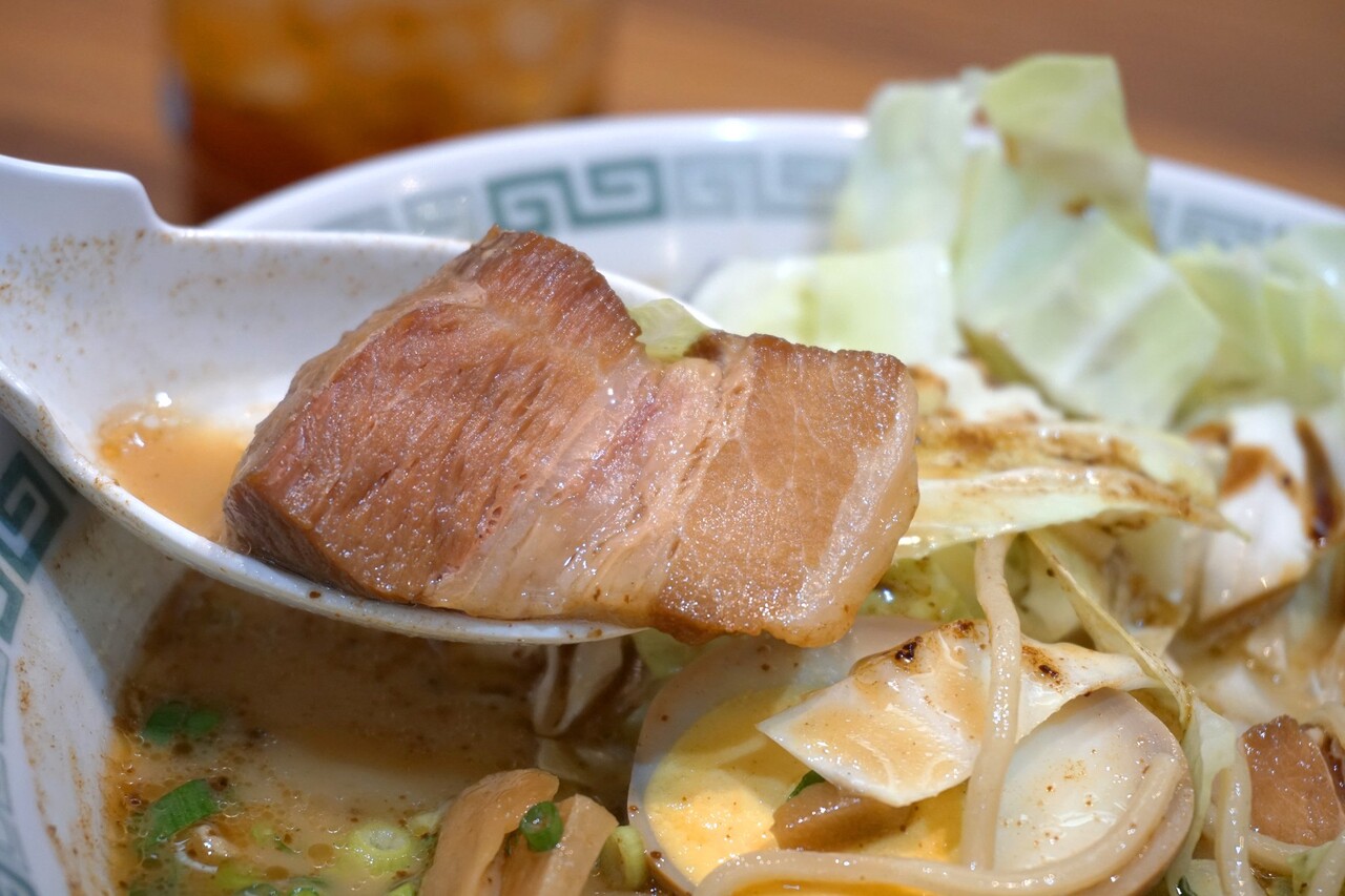 豚バラ肉の角煮と生キャベツがトッピングされているのが特徴です。