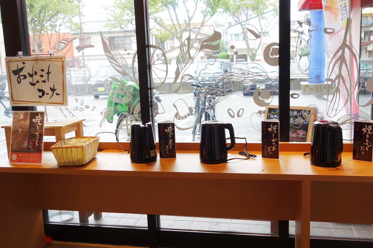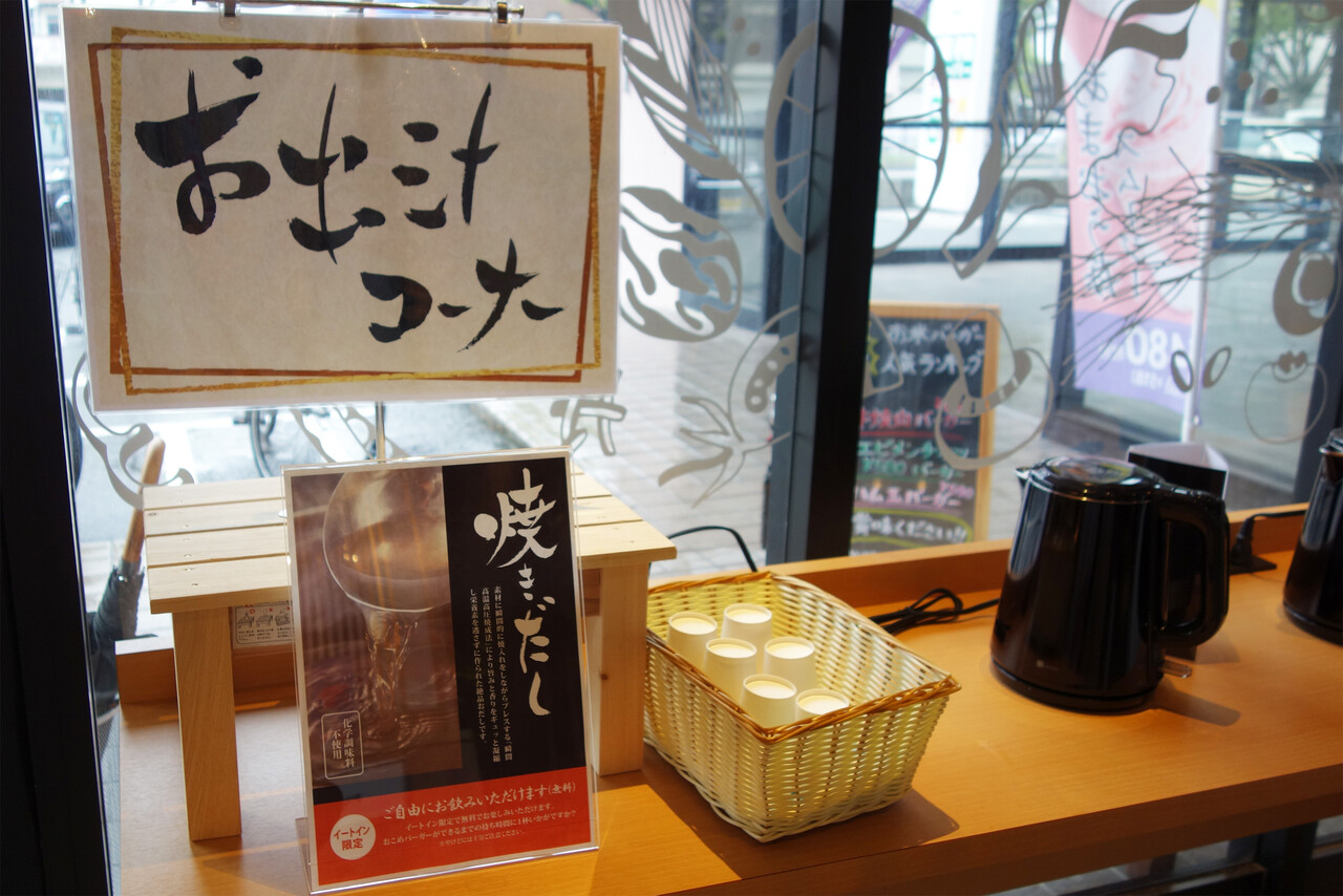 『焼きあごだし』『焼きかつおだし』『焼きふぐだし』が入ったポットが置いてあり、