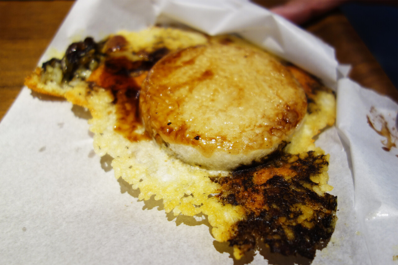 チーズを鉄板で焼き、カリカリ煎餅状にしたものです。