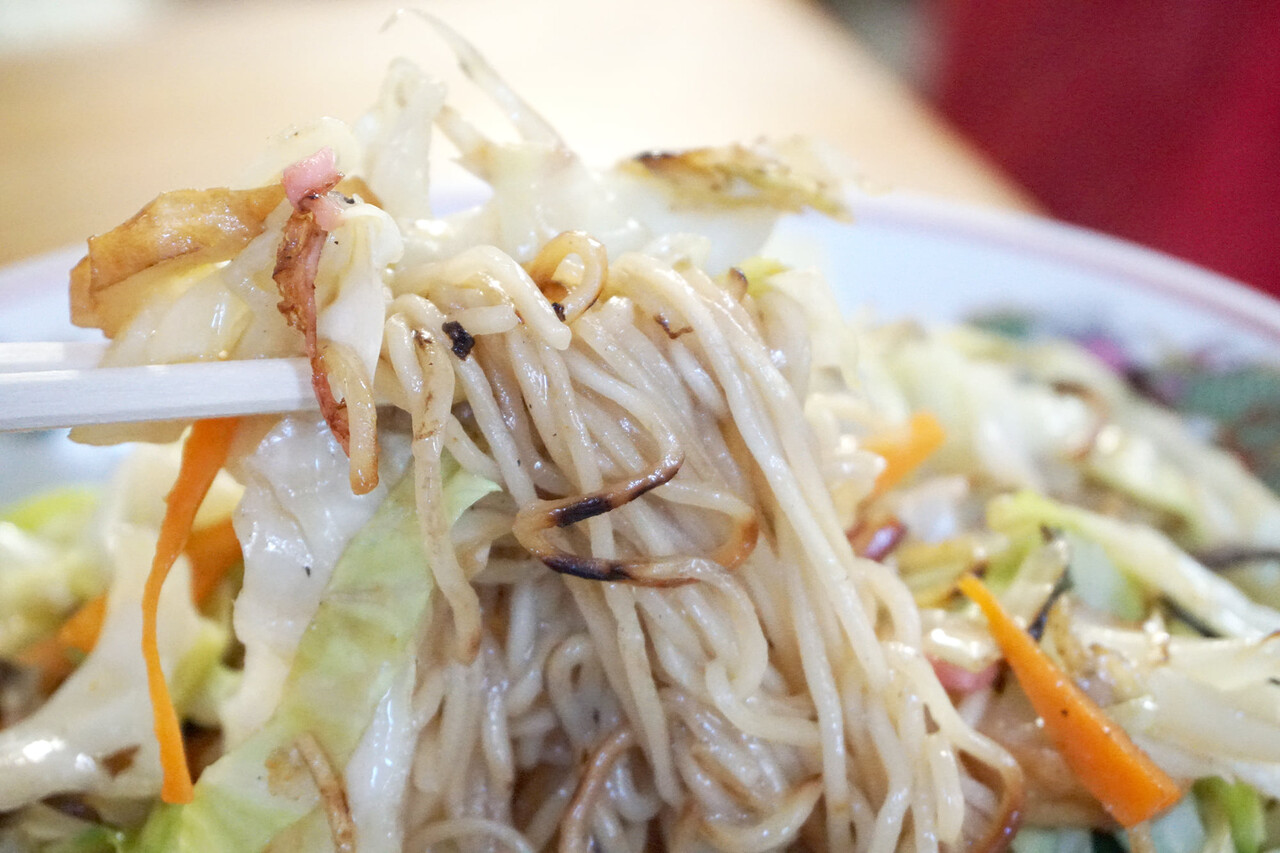 香ばしい炒め野菜の下には、焼き付けた細麺。