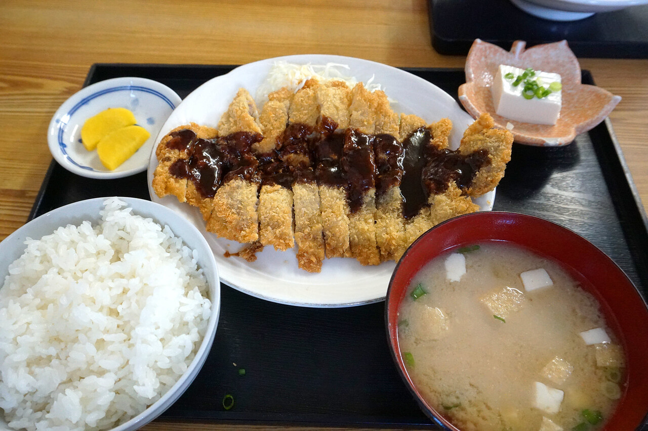 ワラジを思わせるようなトンカツに、ご飯・味噌汁・冷奴・お漬物が付いています。