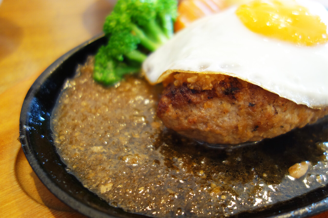 熱々鉄板に、パンパンにふっくら焼き上がったハンバーグと目玉焼き。