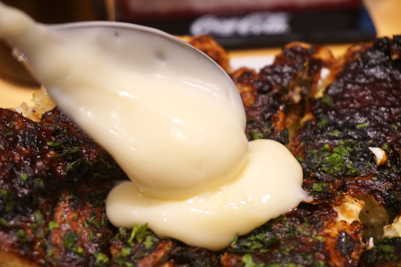 そして禁断の裏ワザ!お好み焼き用のマヨネーズをトッピングしま〜す(笑)。