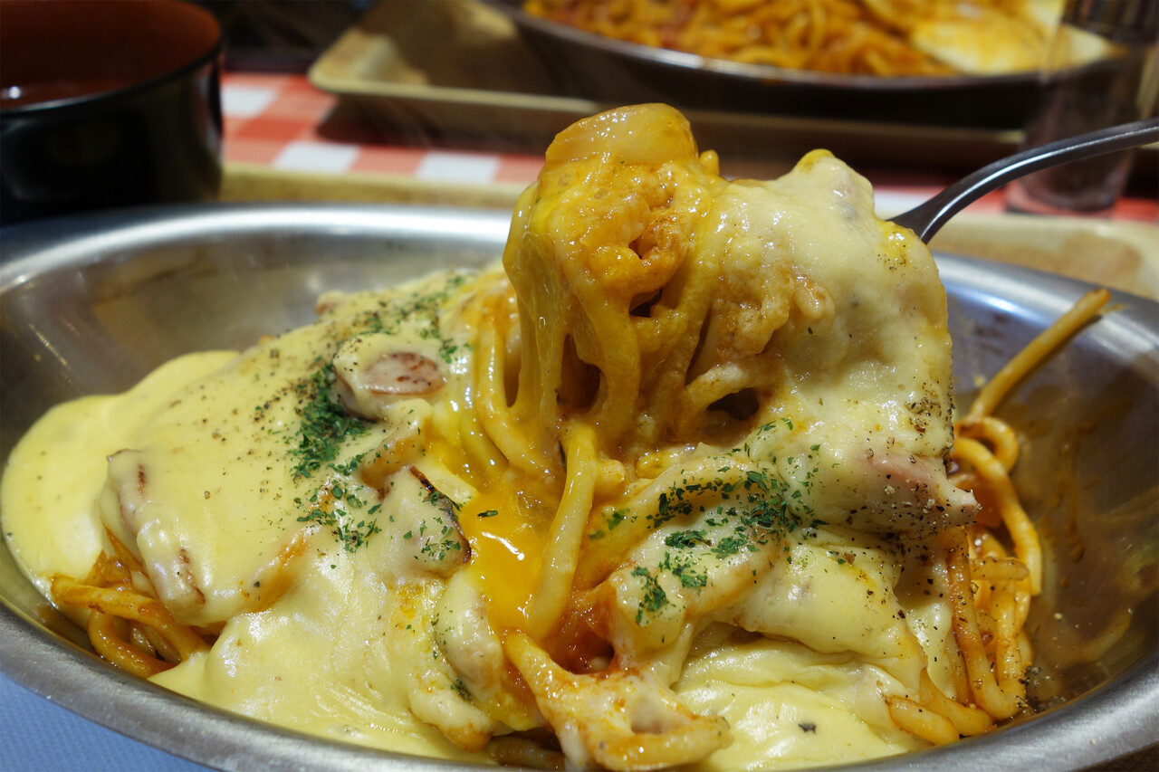 ナポリタンとカルボナーラがコラボした、背徳感満載のスーパーハイカロリーなスパゲティ。