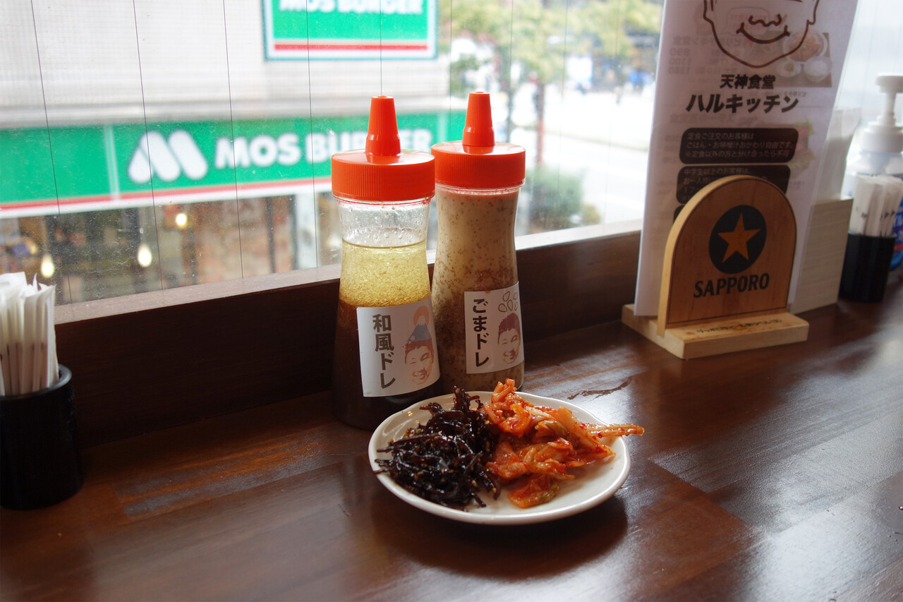 サラダ用ドレッシングは卓上に置いてあり、醤油とゴマドレの2種類。