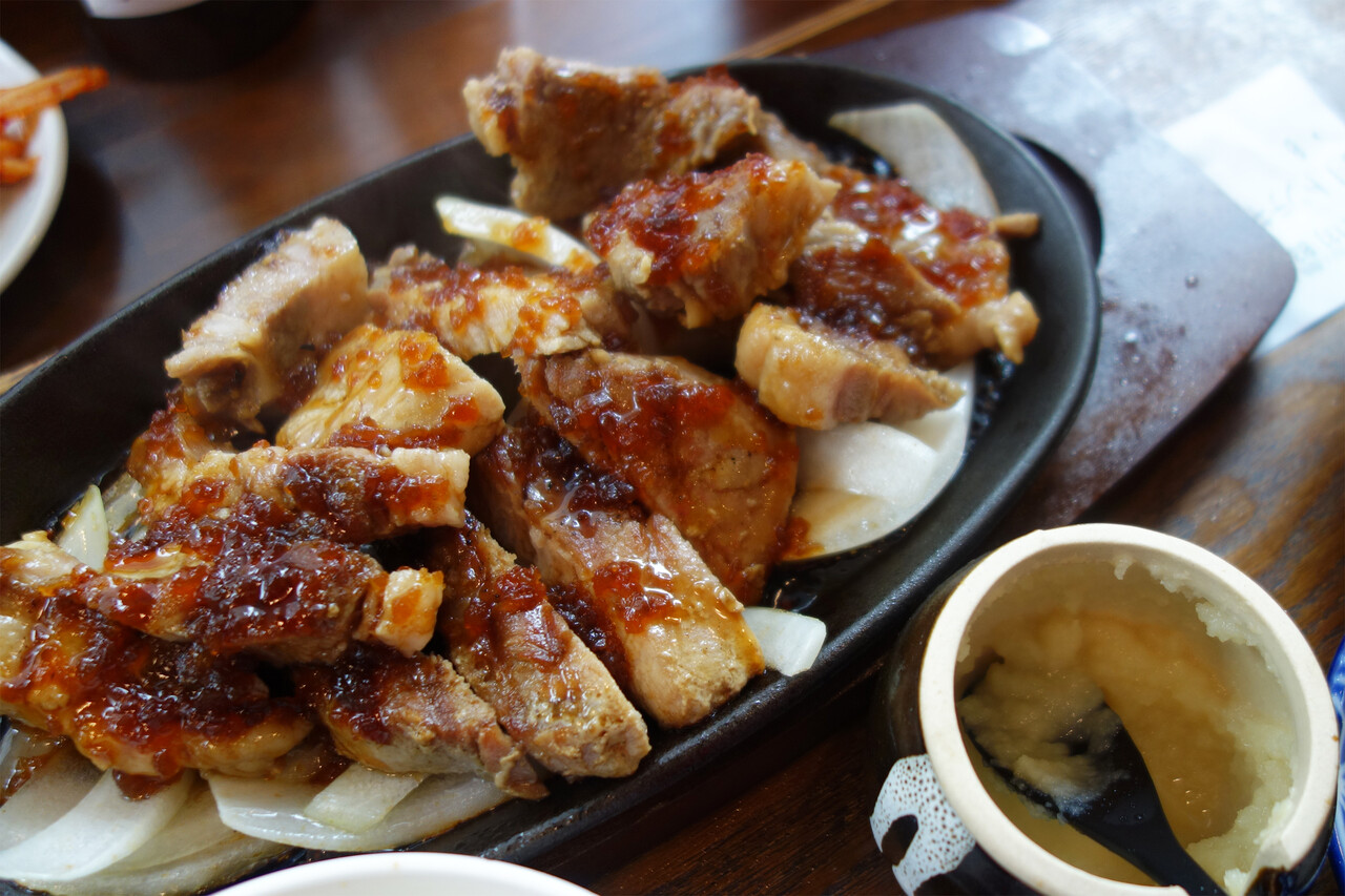こちらのトンテキは、玉ねぎと一緒に熱々鉄板皿で供されます。