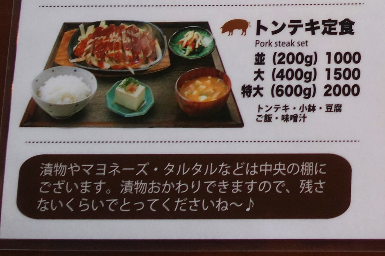 トンテキの量は、200g(並)・400g(大)・600g(特大)があります。