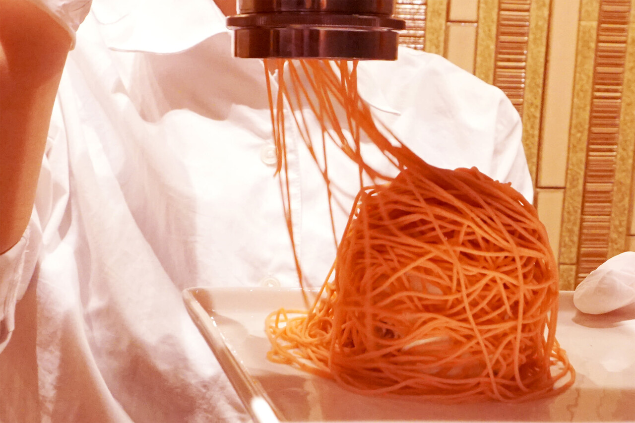 この土台に、シャワーのように流れ、積まれていく極細の栗クリーム。