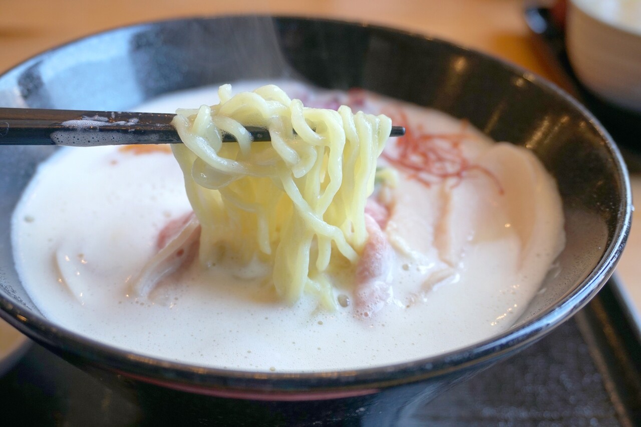 “製麺屋慶史”謹製の縮れ麺が程良く泡を絡めとり、バランス良く麺とスープを頂けます。