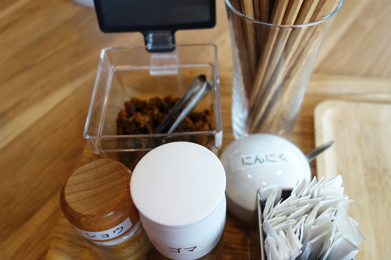 卓上には、辛子高菜・ゴマ・ニンニク・コショウがあります。