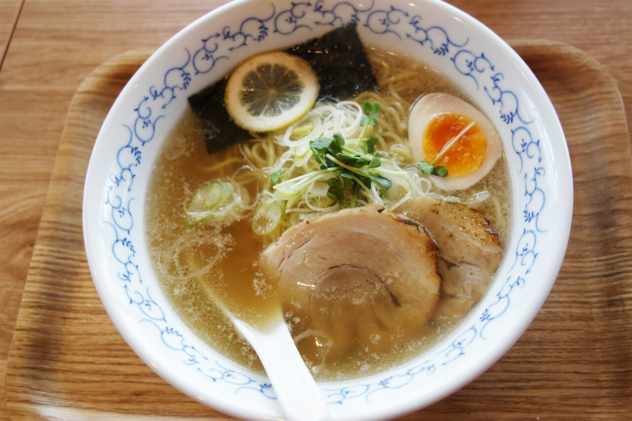厚めのチャーシュー2枚・白ネギ・味玉半分・海苔・貝割大根・レモンスライス。