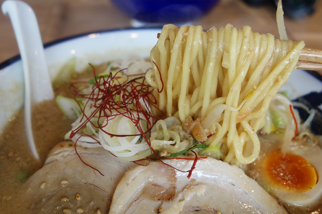 札幌ラーメンみたいにかんすいが効いてない、滑らかストレート麺。