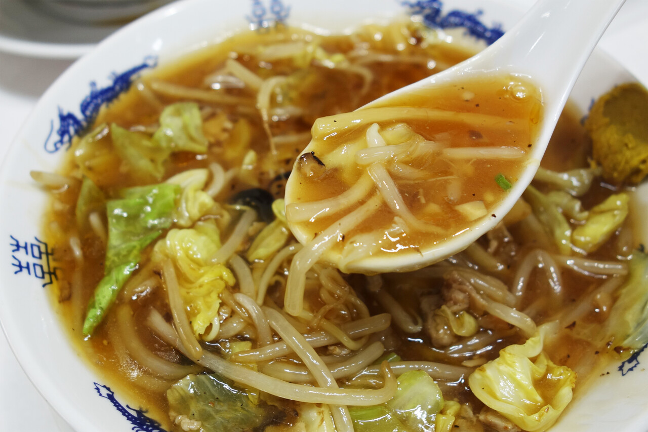 野菜と豚肉を炒めて、醤油味で仕上げた優しい味のあんかけスープ麺。