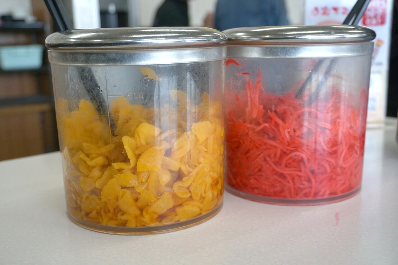 卓上には紅生姜の他に、沢庵のような『はりはり漬け』があるのが珍しい。