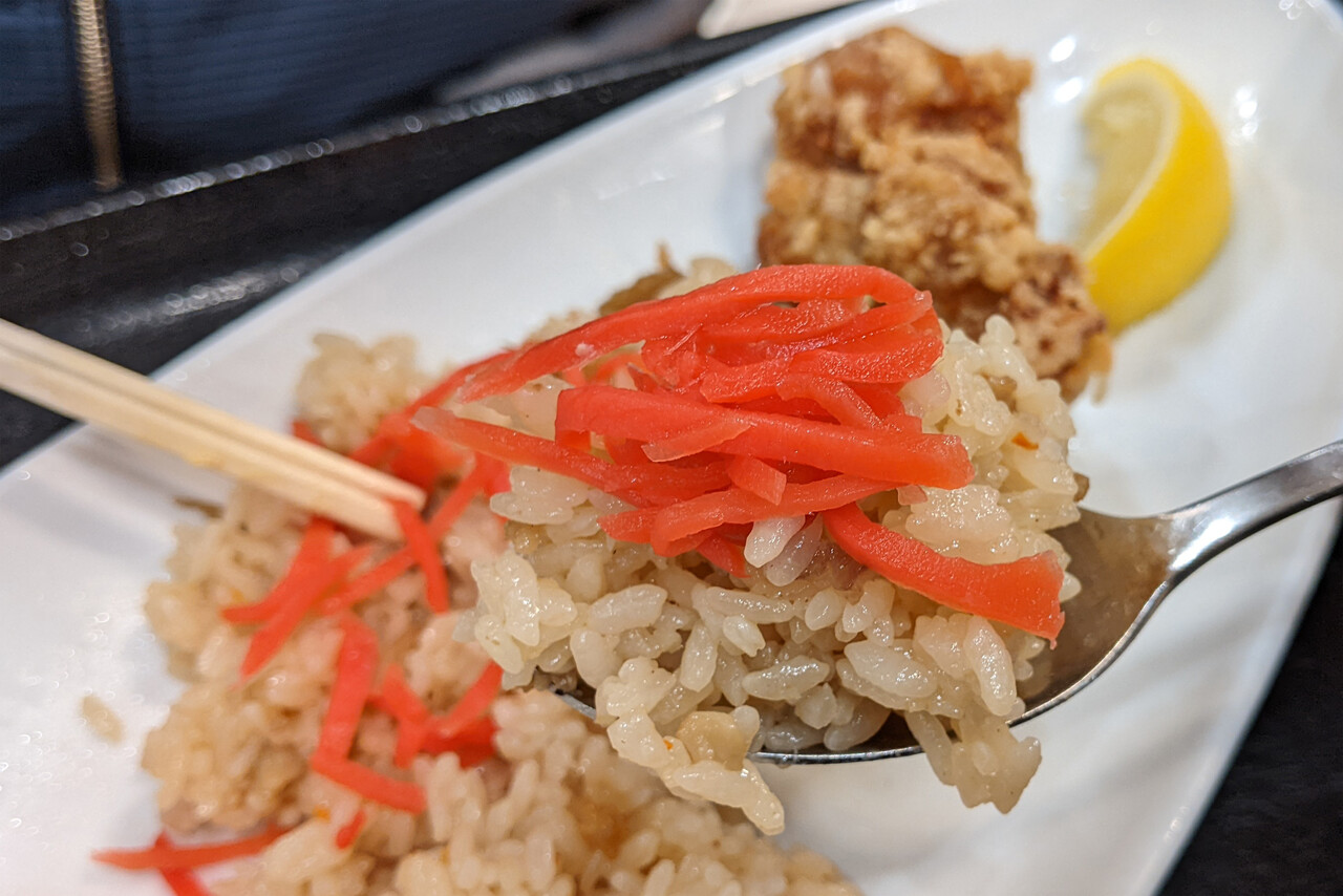 沢庵と紅ショウガが添えられてます。