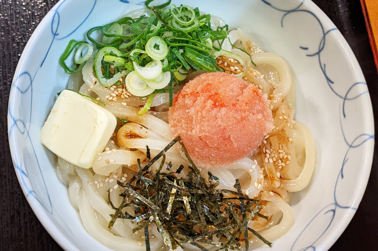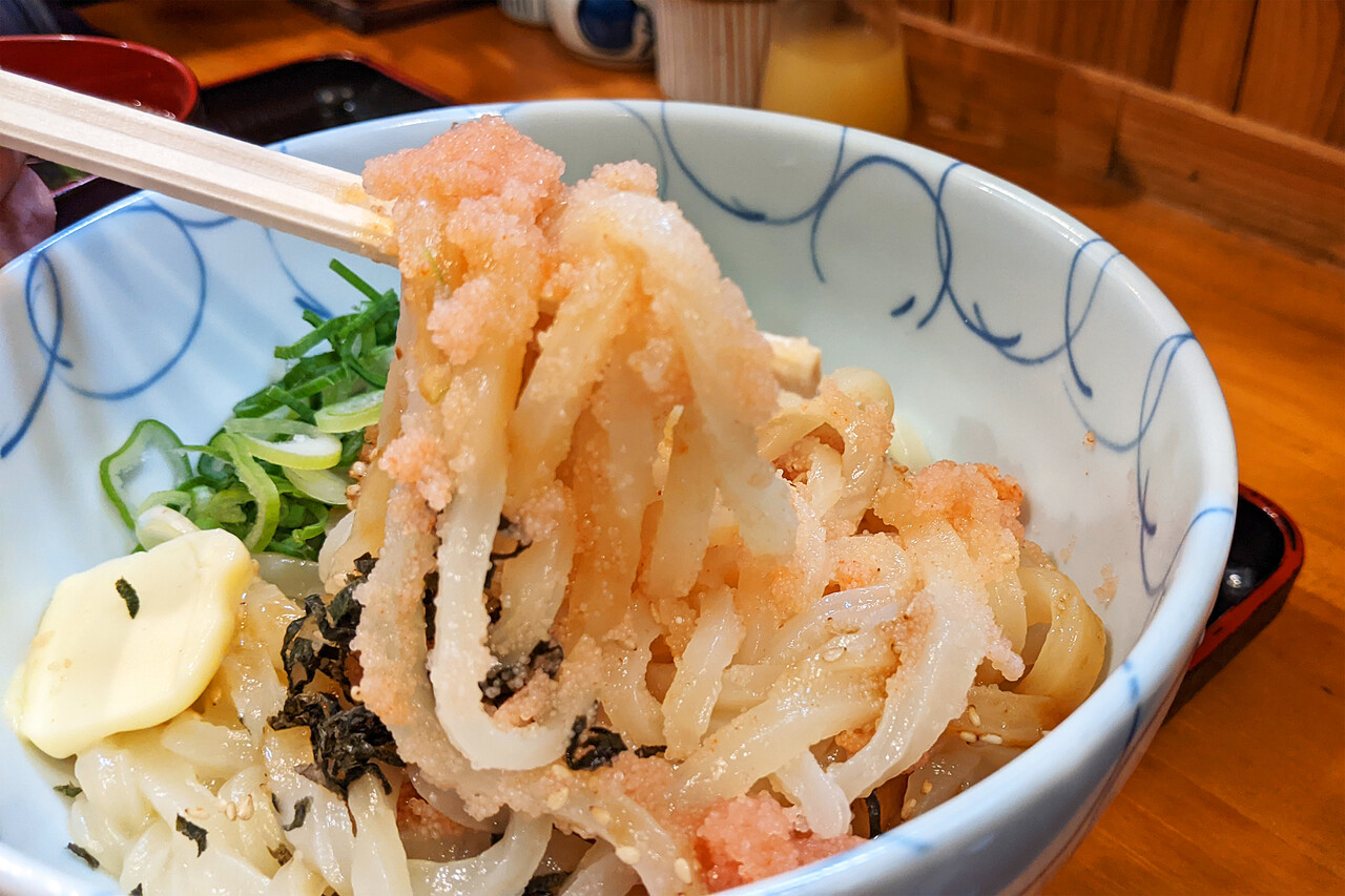 外の看板にあった『今月のおすすめ』は『まぜうどん 明太バター だしスープ付き』740円。