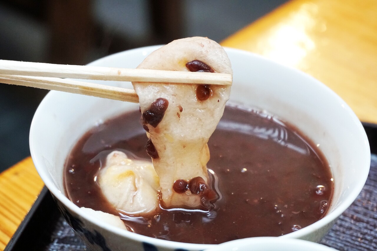 とろっとした甘〜いぜんざいに、カリッと焼かれた餅が美味しい。