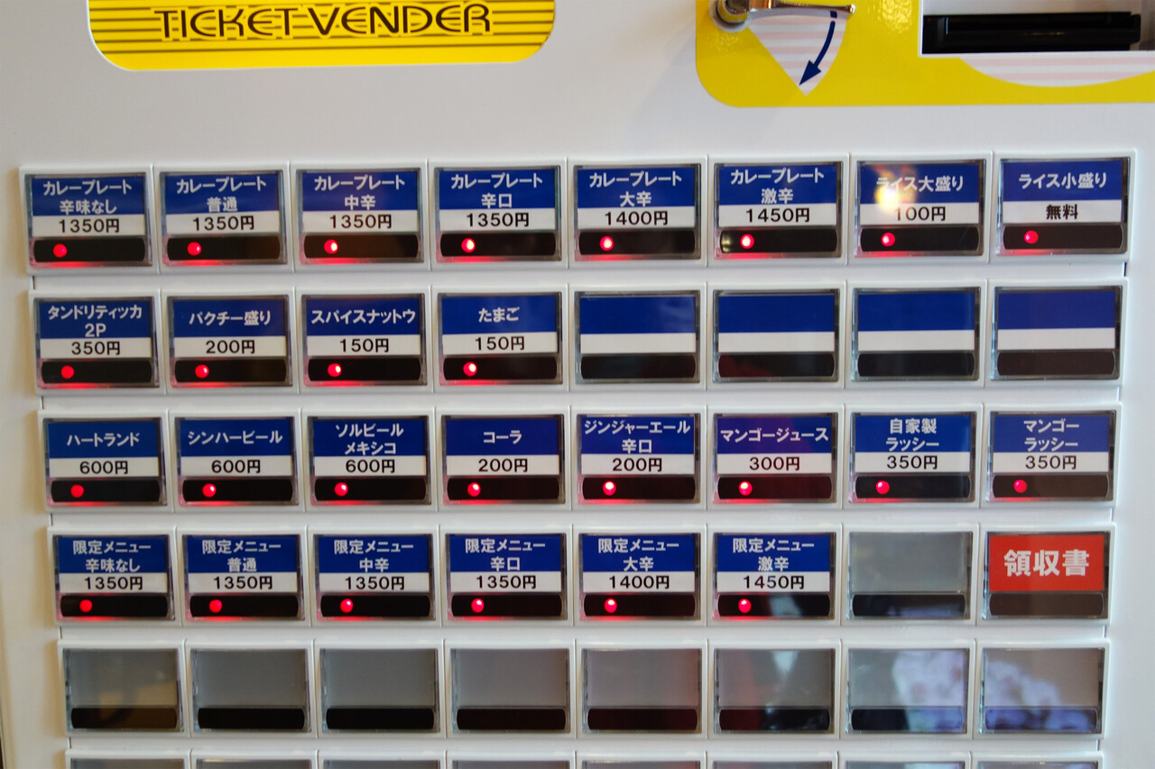 メニューが沢山あるようですが、辛さ別(辛味なし〜激辛)・ライスの量別・トッピング・ドリンクのボタンになってます。
