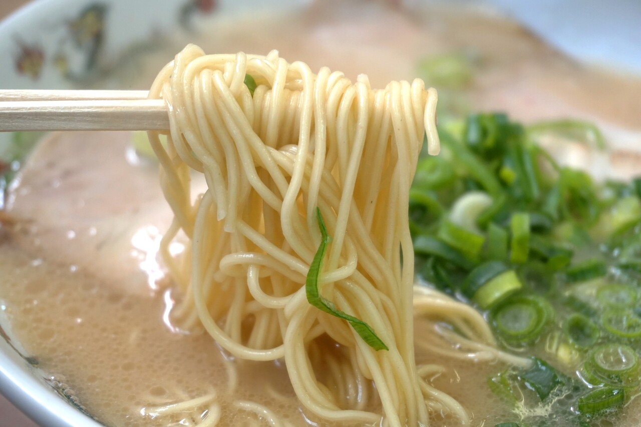 圧力をかけて、断面を楕円化にした特注麺は歯切れのよい食感で、スープの相性をよく考えた仕上がり。